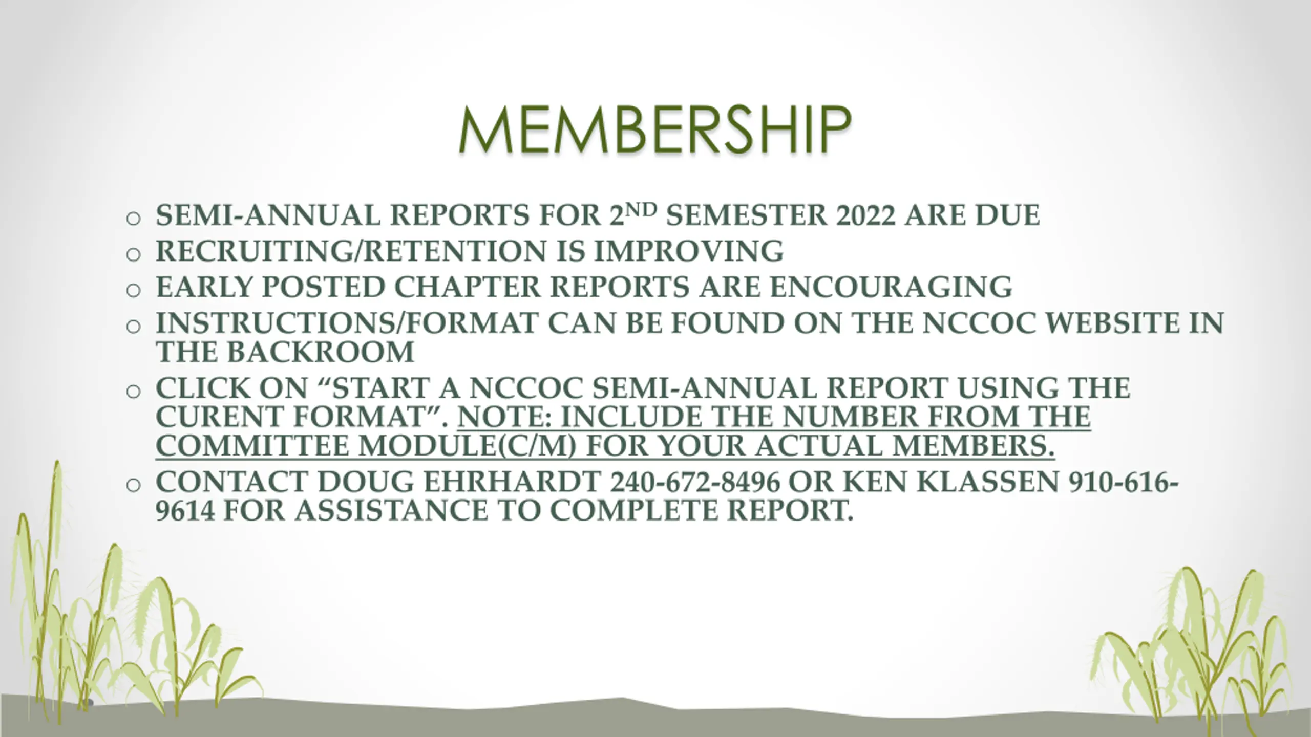 MEMBERSHIP o SEMI-ANNUAL REPORTS FOR 2NDSEMESTER 2022 ARE DUE o RECRUITING/RETENTION IS IMPROVING o EARLY POSTED CHAPTER REPORTS ARE ENCOURAGING o INSTRUCTIONS/FORMAT CAN BE FOUND ON THE NCCOC WEBSITE IN THE BACKROOM o CLICK ON START A NCCOC SEMI-ANNUAL REPORT USING THE CURENT FORMAT . NOTE: INCLUDE THE NUMBER FROM THE COMMITTEE MODULE(C/M) FOR YOUR ACTUAL MEMBERS. o CONTACT DOUG EHRHARDT 240-672-8496 OR KEN KLASSEN 910-616- 9614 FOR ASSISTANCE TO COMPLETE REPORT.