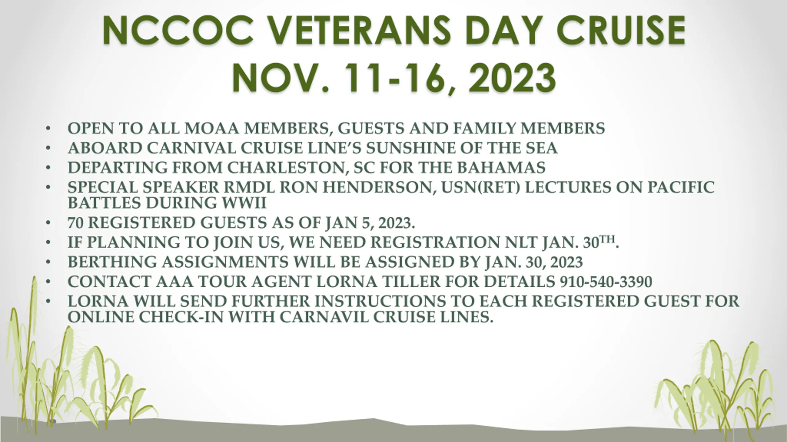 NCCOC VETERANS DAY CRUISE NOV. 11-16, 2023 OPEN TO ALL MOAA MEMBERS, GUESTS AND FAMILY MEMBERS ABOARD CARNIVAL CRUISE LINE S SUNSHINE OF THE SEA DEPARTING FROM CHARLESTON, SC FOR THE BAHAMAS SPECIAL SPEAKER RMDL RON HENDERSON, USN(RET) LECTURES ON PACIFIC BATTLES DURING WWII 70 REGISTERED GUESTS AS OF JAN 5, 2023. IF PLANNING TO JOIN US, WE NEED REGISTRATION NLT JAN. 30TH. BERTHING ASSIGNMENTS WILL BE ASSIGNED BY JAN. 30, 2023 CONTACT AAA TOUR AGENT LORNA TILLER FOR DETAILS 910-540-3390 LORNA WILL SEND FURTHER INSTRUCTIONS TO EACH REGISTERED GUEST FOR ONLINE CHECK-IN WITH CARNAVIL CRUISE LINES.