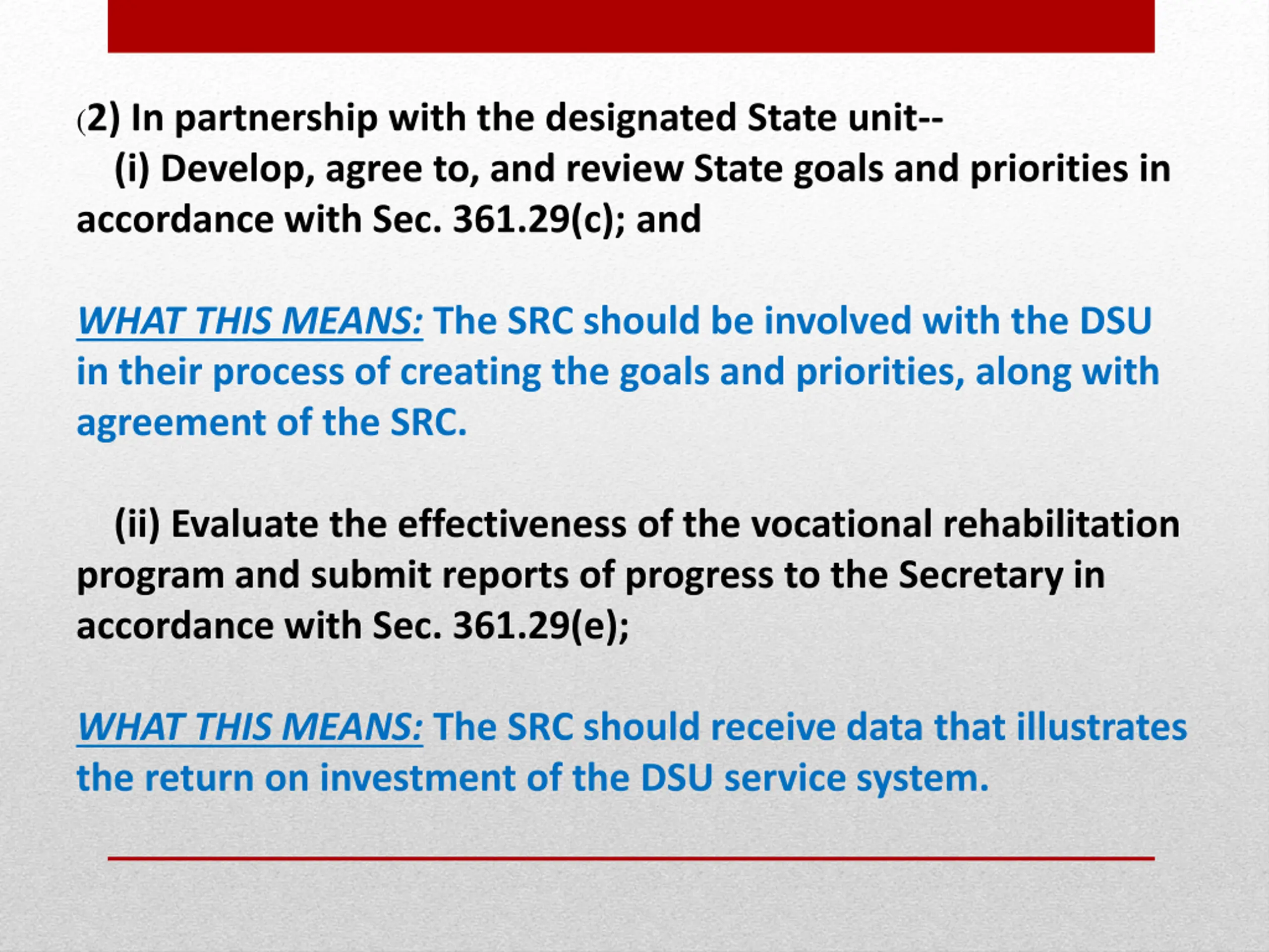 (2) In partnership with the designated State unit-- (i) Develop, agree to, and review State goals and priorities in accordance with Sec. 361.29(c); and WHAT THIS MEANS: The SRC should be involved with the DSU in their process of creating the goals and priorities, along with agreement of the SRC. (ii) Evaluate the effectiveness of the vocational rehabilitation program and submit reports of progress to the Secretary in accordance with Sec. 361.29(e); WHAT THIS MEANS: The SRC should receive data that illustrates the return on investment of the DSU service system.
