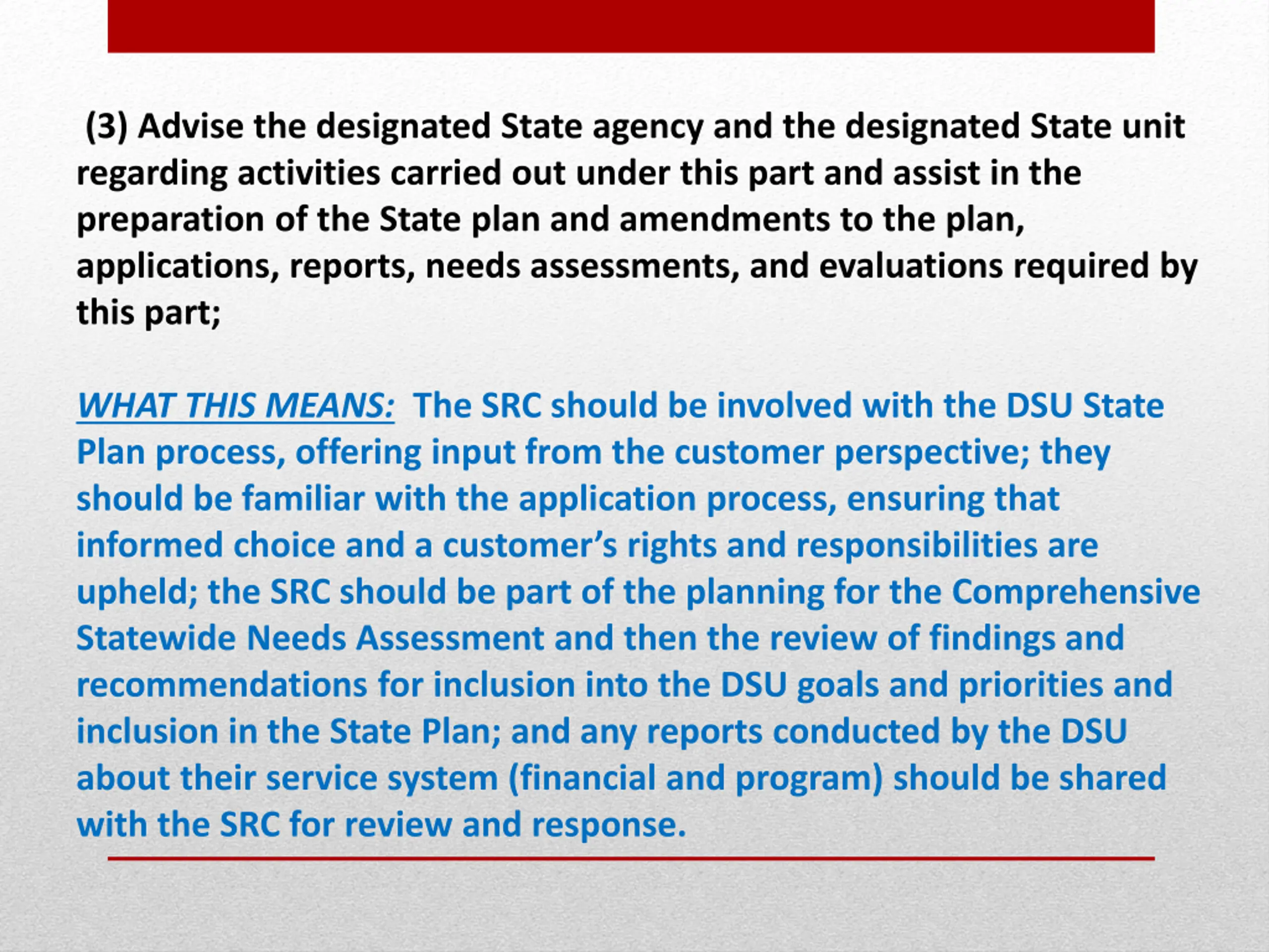(3) Advise the designated State agency and the designated State unit regarding activities carried out under this part and assist in the preparation of the State plan and amendments to the plan, applications, reports, needs assessments, and evaluations required by this part; WHAT THIS MEANS: The SRC should be involved with the DSU State Plan process, offering input from the customer perspective; they should be familiar with the application process, ensuring that informed choice and a customer s rights and responsibilities are upheld; the SRC should be part of the planning for the Comprehensive Statewide Needs Assessment and then the review of findings and recommendations for inclusion into the DSU goals and priorities and inclusion in the State Plan; and any reports conducted by the DSU about their service system (financial and program) should be shared with the SRC for review and response.