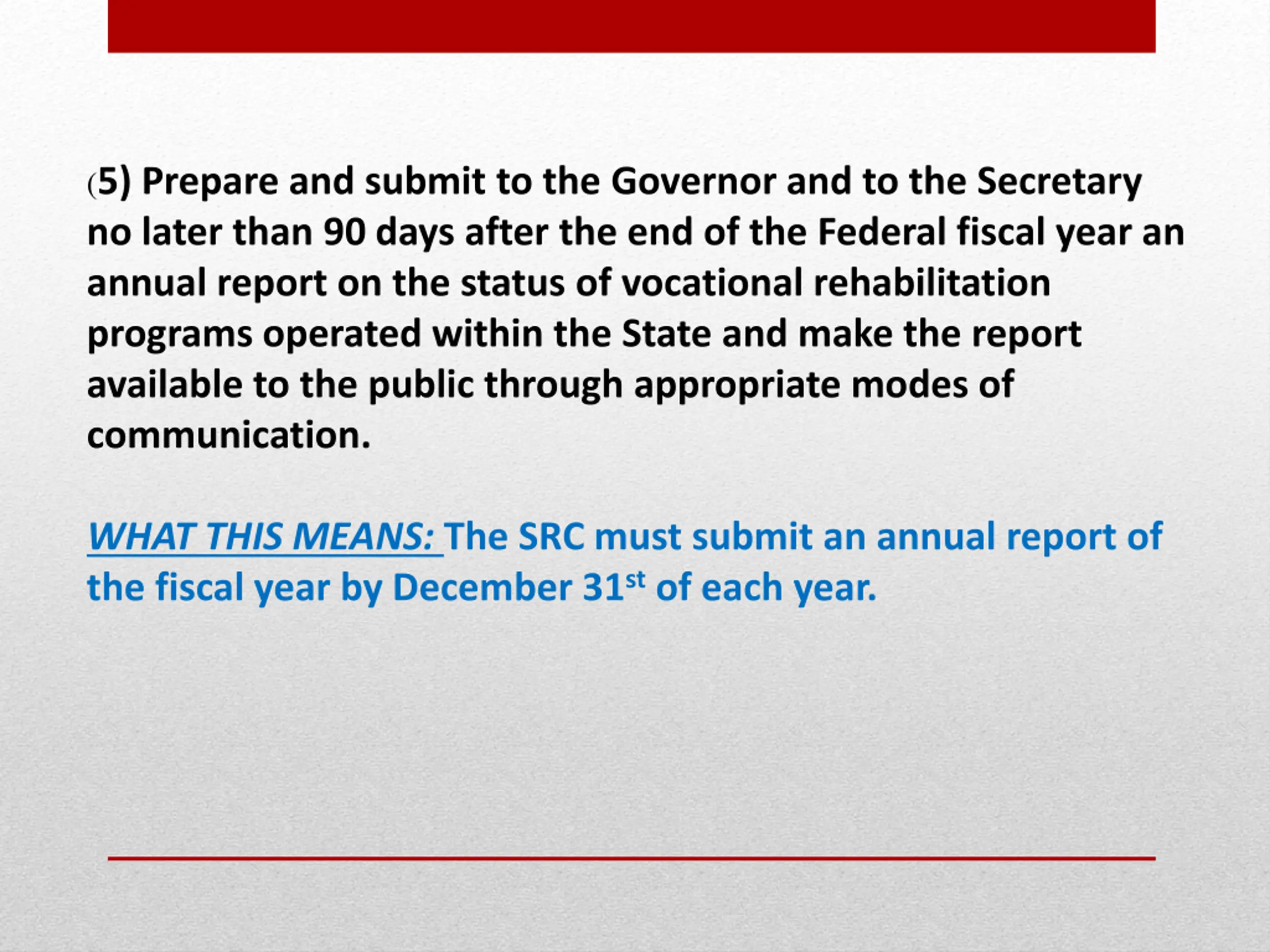(5) Prepare and submit to the Governor and to the Secretary no later than 90 days after the end of the Federal fiscal year an annual report on the status of vocational rehabilitation programs operated within the State and make the report available to the public through appropriate modes of communication. WHAT THIS MEANS: The SRC must submit an annual report of the fiscal year by December 31st of each year.