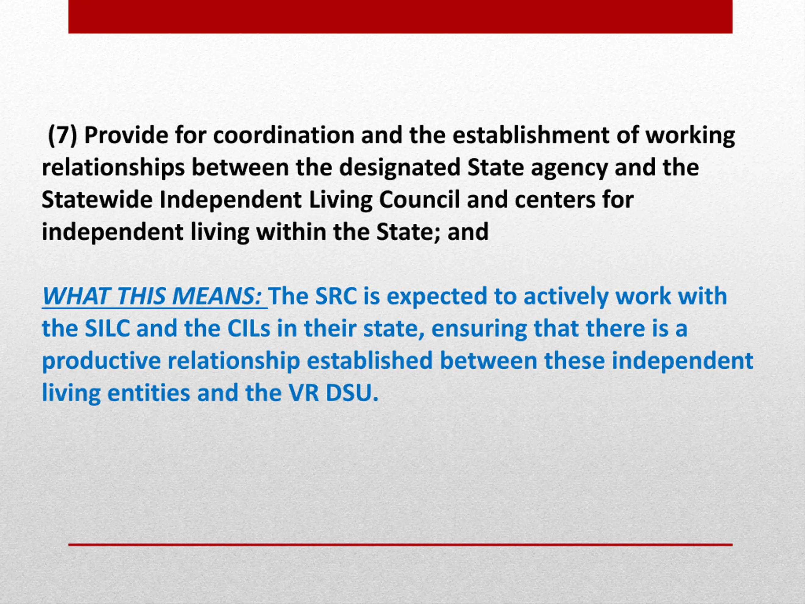 (7) Provide for coordination and the establishment of working relationships between the designated State agency and the Statewide Independent Living Council and centers for independent living within the State; and WHAT THIS MEANS: The SRC is expected to actively work with the SILC and the CILs in their state, ensuring that there is a productive relationship established between these independent living entities and the VR DSU.