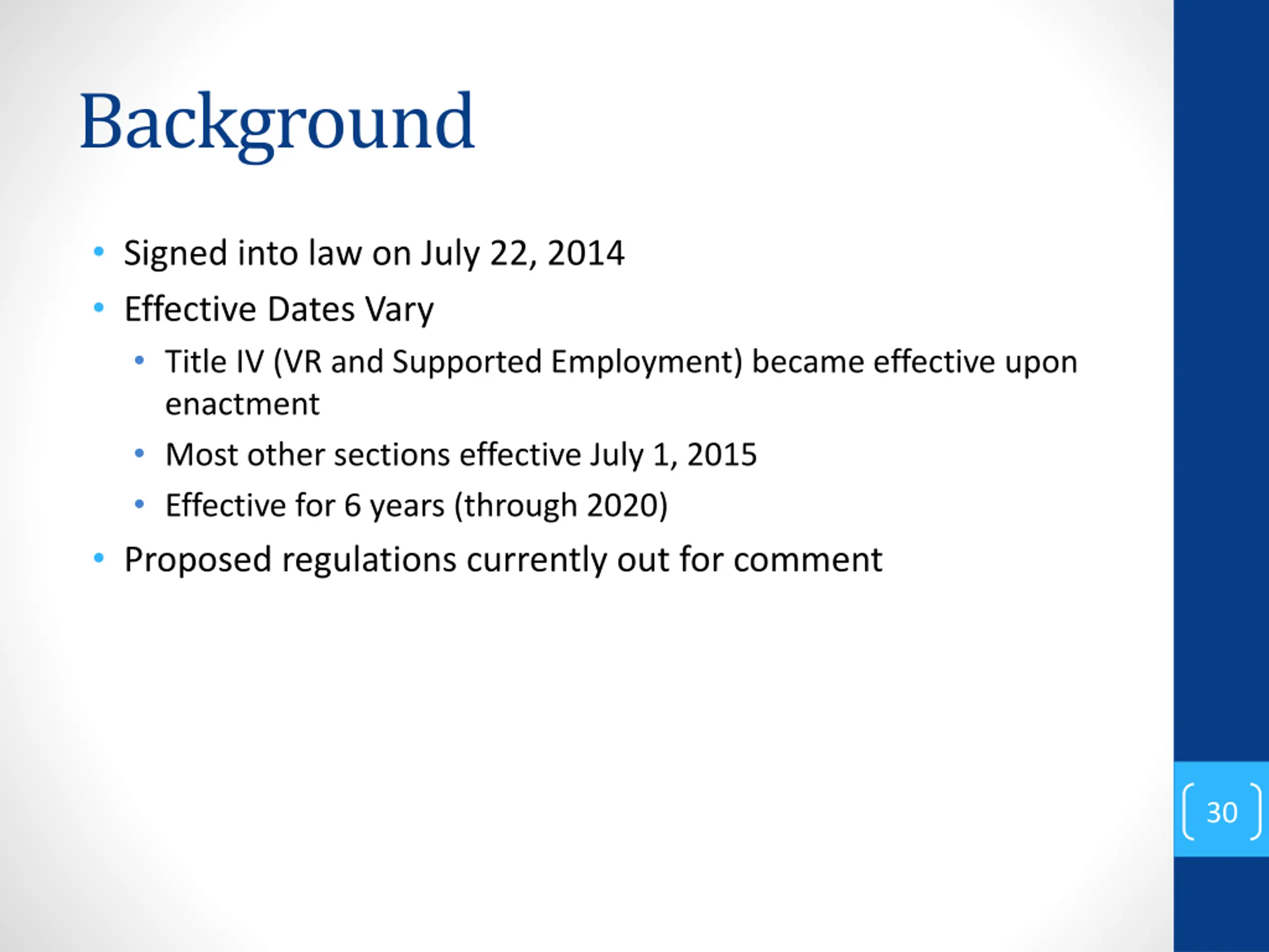 Background Signed into law on July 22, 2014 Effective Dates Vary Title IV (VR and Supported Employment) became effective upon enactment Most other sections effective July 1, 2015 Effective for 6 years (through 2020) Proposed regulations currently out for comment 30