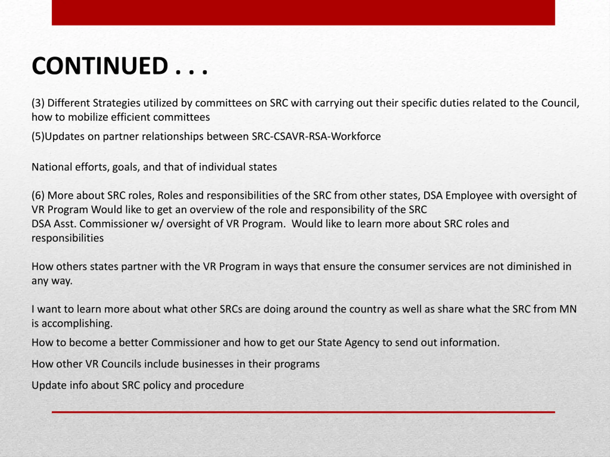 CONTINUED . . . (3) Different Strategies utilized by committees on SRC with carrying out their specific duties related to the Council, how to mobilize efficient committees (5)Updates on partner relationships between SRC-CSAVR-RSA-Workforce National efforts, goals, and that of individual states (6) More about SRC roles, Roles and responsibilities of the SRC from other states, DSA Employee with oversight of VR Program Would like to get an overview of the role and responsibility of the SRC DSA Asst. Commissioner w/ oversight of VR Program. Would like to learn more about SRC roles and responsibilities How others states partner with the VR Program in ways that ensure the consumer services are not diminished in any way. I want to learn more about what other SRCs are doing around the country as well as share what the SRC from MN is accomplishing. How to become a better Commissioner and how to get our State Agency to send out information. How other VR Councils include businesses in their programs Update info about SRC policy and procedure