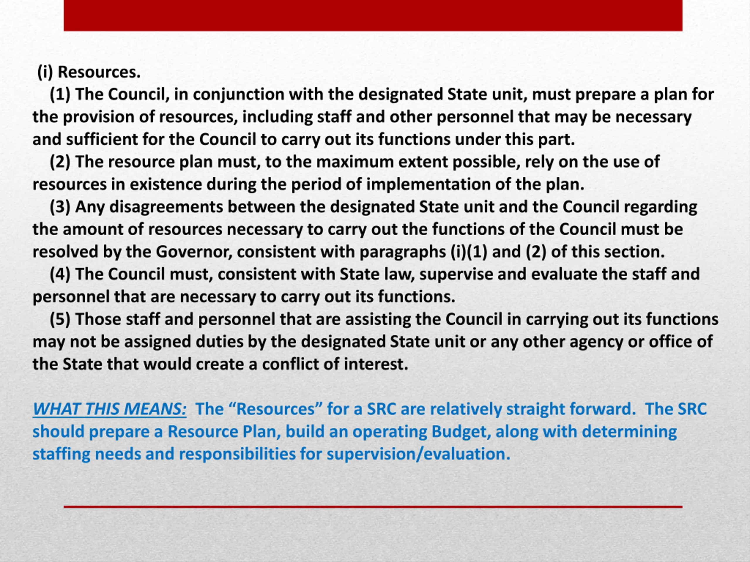 (i) Resources. (1) The Council, in conjunction with the designated State unit, must prepare a plan for the provision of resources, including staff and other personnel that may be necessary and sufficient for the Council to carry out its functions under this part. (2) The resource plan must, to the maximum extent possible, rely on the use of resources in existence during the period of implementation of the plan. (3) Any disagreements between the designated State unit and the Council regarding the amount of resources necessary to carry out the functions of the Council must be resolved by the Governor, consistent with paragraphs (i)(1) and (2) of this section. (4) The Council must, consistent with State law, supervise and evaluate the staff and personnel that are necessary to carry out its functions. (5) Those staff and personnel that are assisting the Council in carrying out its functions may not be assigned duties by the designated State unit or any other agency or office of the State that would create a conflict of interest. WHAT THIS MEANS:The Resources for a SRC are relatively straight forward. The SRC should prepare a Resource Plan, build an operating Budget, along with determining staffing needs and responsibilities for supervision/evaluation.