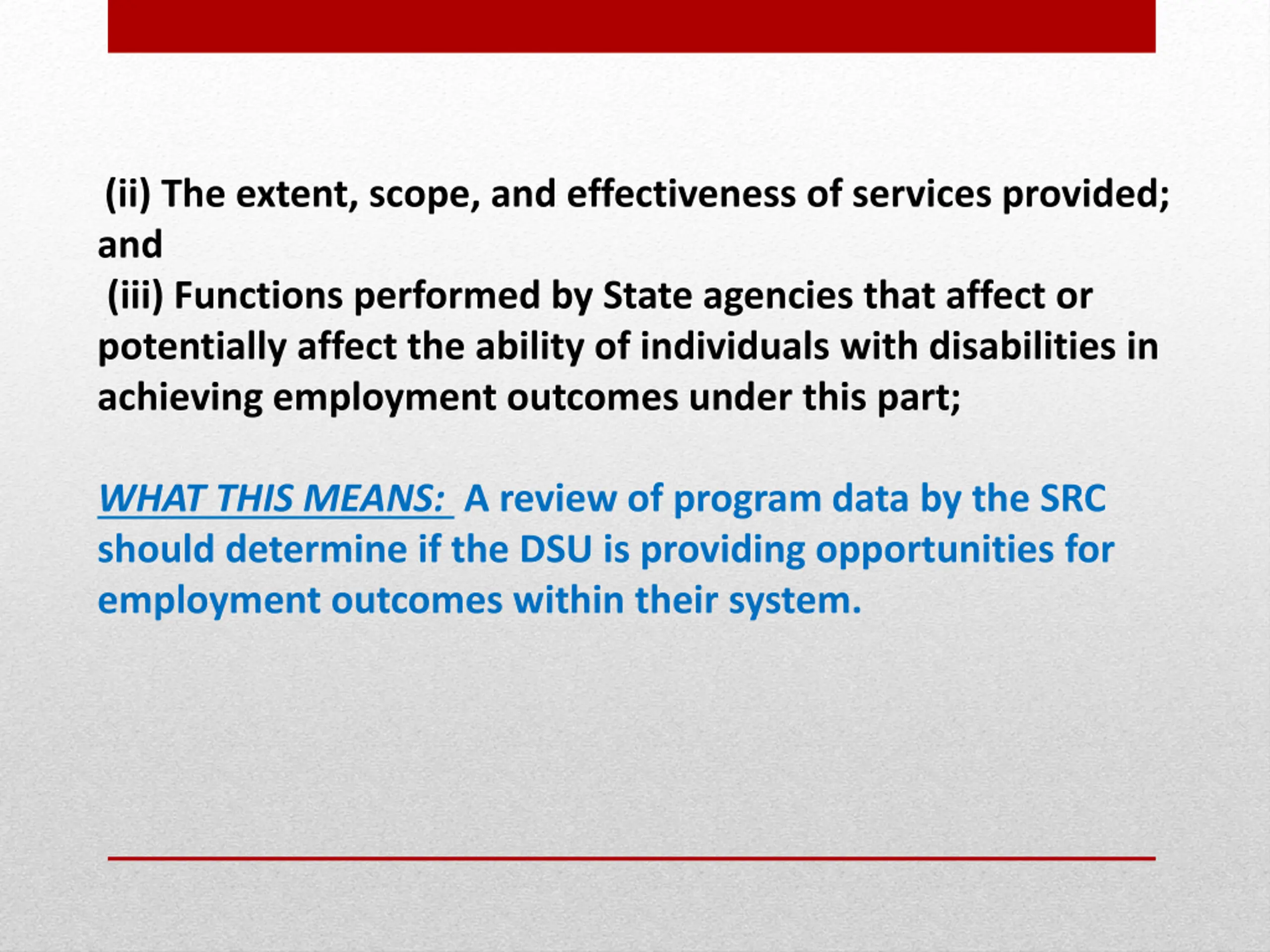 (ii) The extent, scope, and effectiveness of services provided; and (iii) Functions performed by State agencies that affect or potentially affect the ability of individuals with disabilities in achieving employment outcomes under this part; WHAT THIS MEANS: A review of program data by the SRC should determine if the DSU is providing opportunities for employment outcomes within their system.