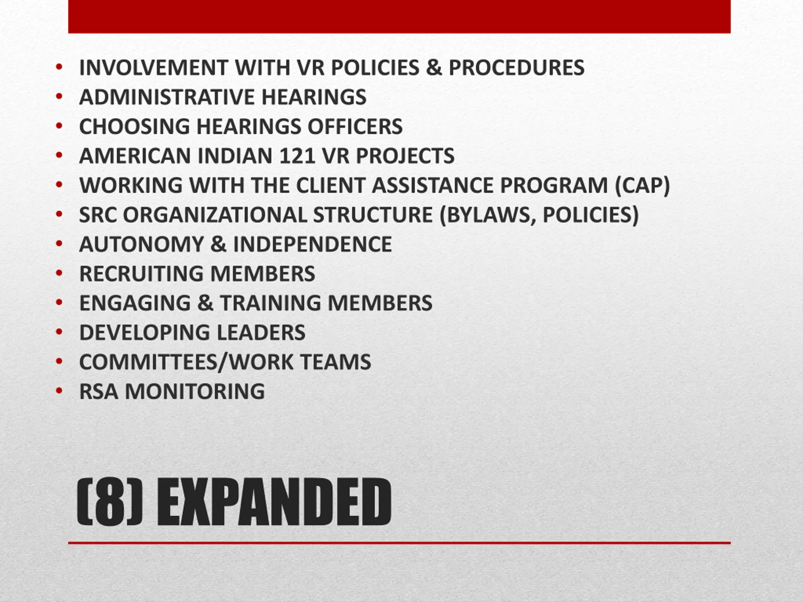 INVOLVEMENT WITH VR POLICIES & PROCEDURES ADMINISTRATIVE HEARINGS CHOOSING HEARINGS OFFICERS AMERICAN INDIAN 121 VR PROJECTS WORKING WITH THE CLIENT ASSISTANCE PROGRAM (CAP) SRC ORGANIZATIONAL STRUCTURE (BYLAWS, POLICIES) AUTONOMY & INDEPENDENCE RECRUITING MEMBERS ENGAGING & TRAINING MEMBERS DEVELOPING LEADERS COMMITTEES/WORK TEAMS RSA MONITORING (8) EXPANDED
