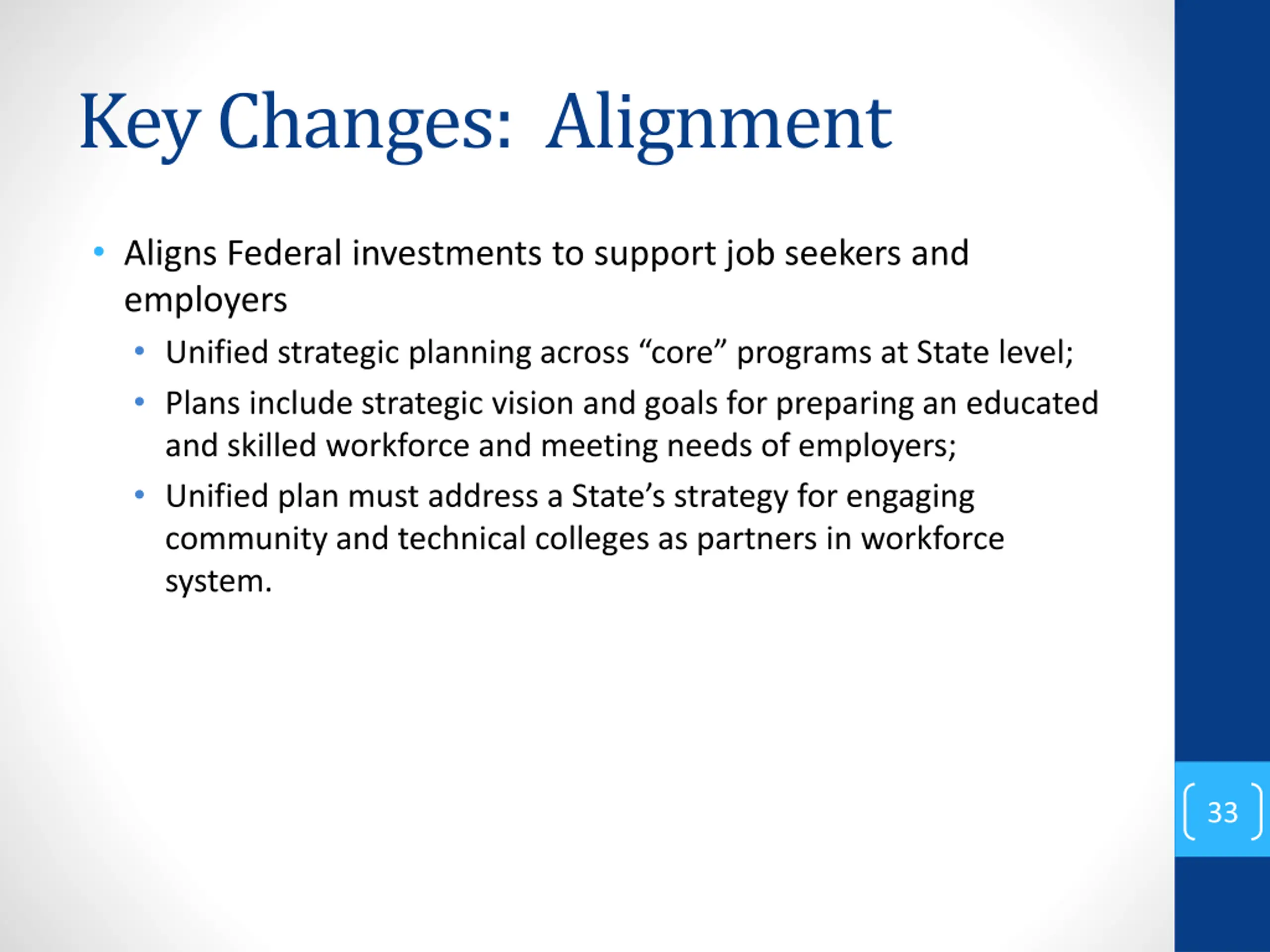 Key Changes: Alignment Aligns Federal investments to support job seekers and employers Unified strategic planning across core programs at State level; Plans include strategic vision and goals for preparing an educated and skilled workforce and meeting needs of employers; Unified plan must address a State s strategy for engaging community and technical colleges as partners in workforce system. 33