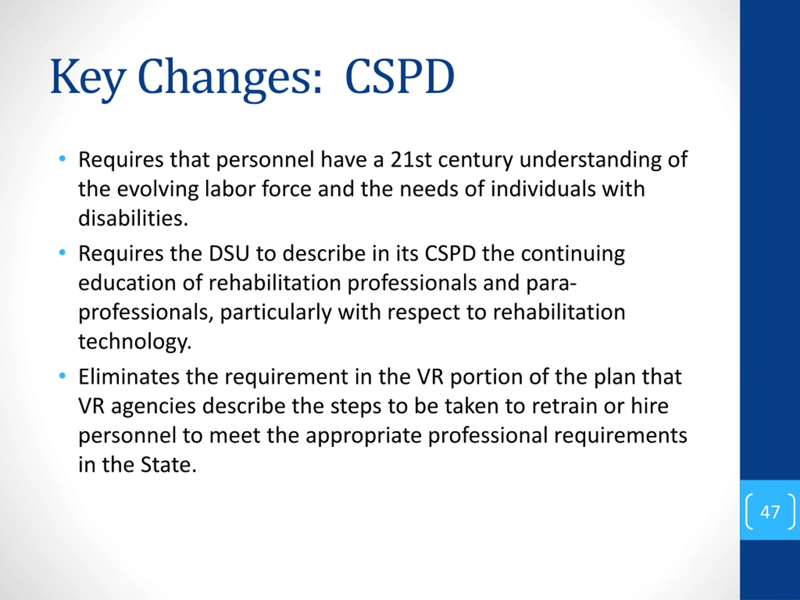 Key Changes: CSPD Requires that personnel have a 21st century understanding of the evolving labor force and the needs of individuals with disabilities. Requires the DSU to describe in its CSPD the continuing education of rehabilitation professionals and para- professionals, particularly with respect to rehabilitation technology. Eliminates the requirement in the VR portion of the plan that VR agencies describe the steps to be taken to retrain or hire personnel to meet the appropriate professional requirements in the State. 47