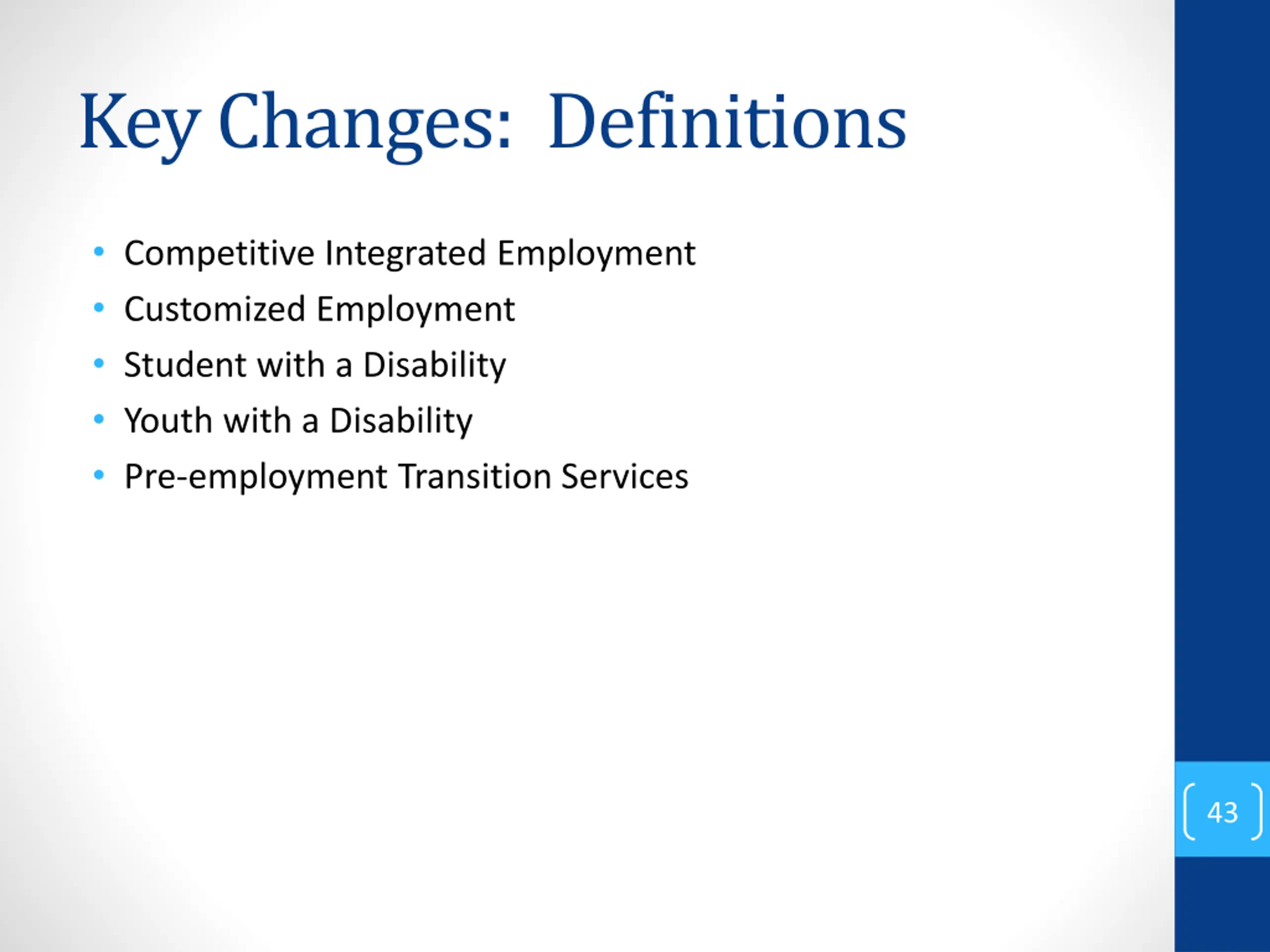 Key Changes: Definitions Competitive Integrated Employment Customized Employment Student with a Disability Youth with a Disability Pre-employment Transition Services 43
