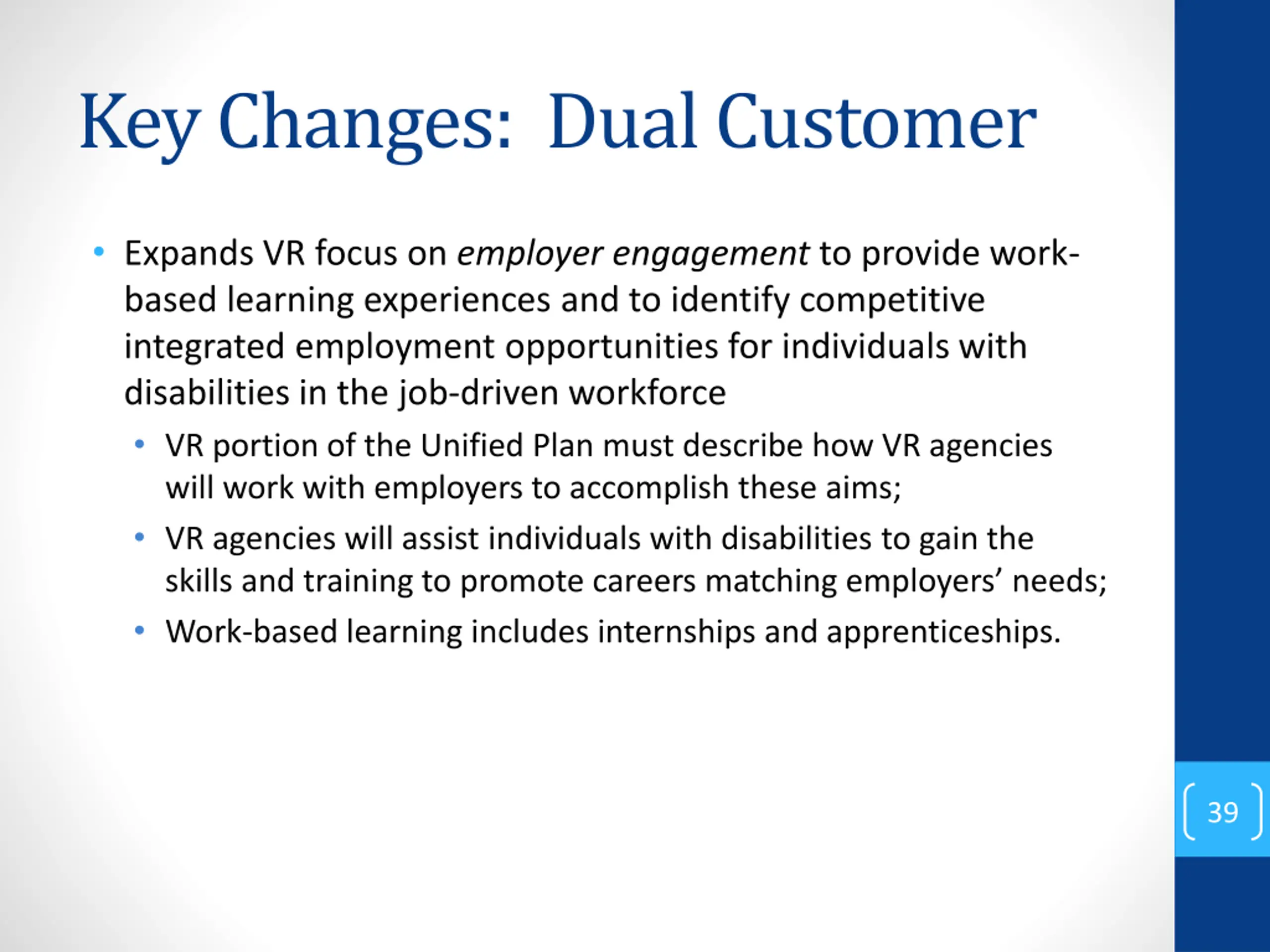 Key Changes: Dual Customer Expands VR focus on employer engagement to provide work- based learning experiences and to identify competitive integrated employment opportunities for individuals with disabilities in the job-driven workforce VR portion of the Unified Plan must describe how VR agencies will work with employers to accomplish these aims; VR agencies will assist individuals with disabilities to gain the skills and training to promote careers matching employers needs; Work-based learning includes internships and apprenticeships. 39
