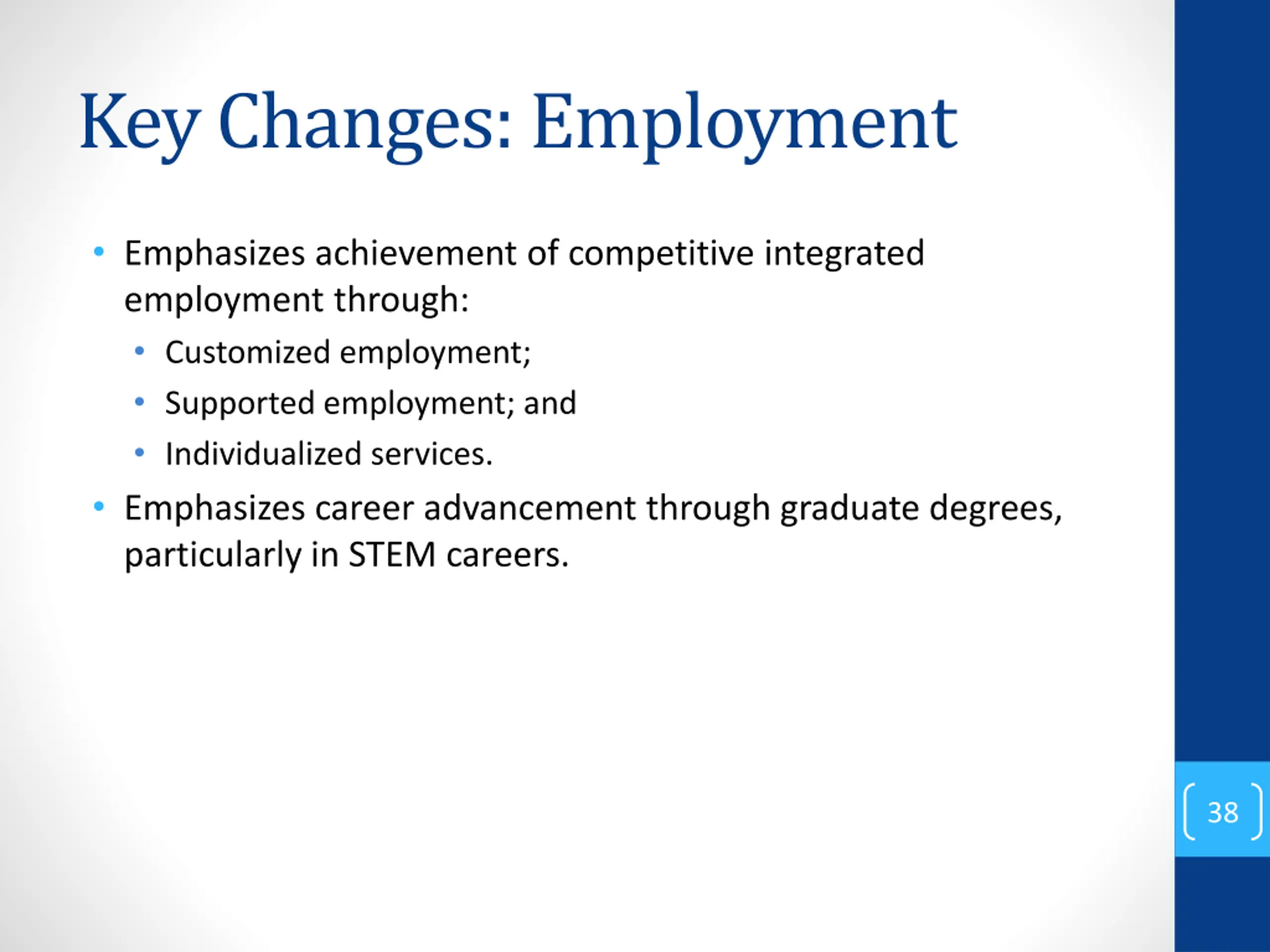 Key Changes: Employment Emphasizes achievement of competitive integrated employment through: Customized employment; Supported employment; and Individualized services. Emphasizes career advancement through graduate degrees, particularly in STEM careers. 38