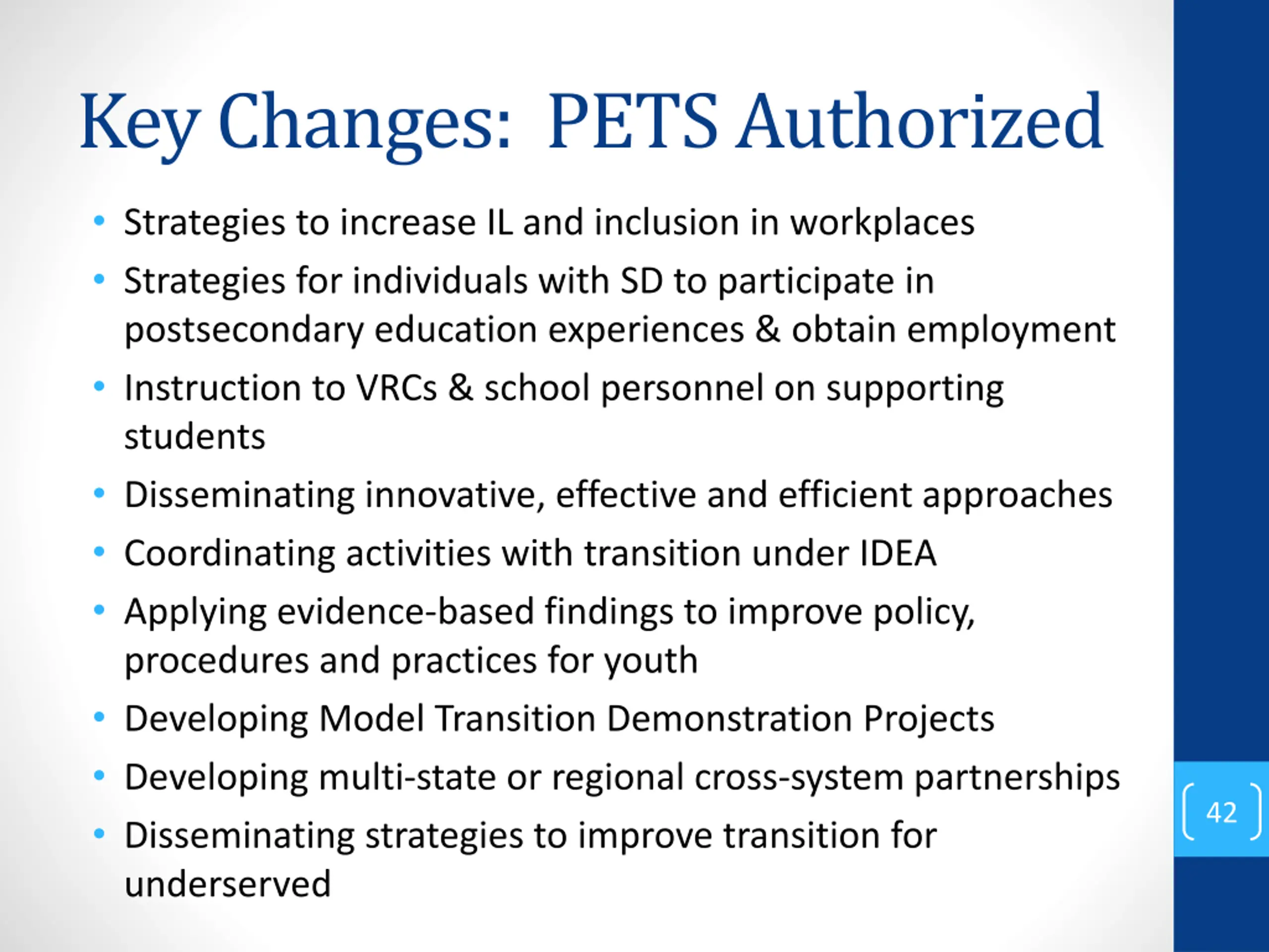 Key Changes: PETS Authorized Strategies to increase IL and inclusion in workplaces Strategies for individuals with SD to participate in postsecondary education experiences & obtain employment Instruction to VRCs & school personnel on supporting students Disseminating innovative, effective and efficient approaches Coordinating activities with transition under IDEA Applying evidence-based findings to improve policy, procedures and practices for youth Developing Model Transition Demonstration Projects Developing multi-state or regional cross-system partnerships Disseminating strategies to improve transition for underserved 42
