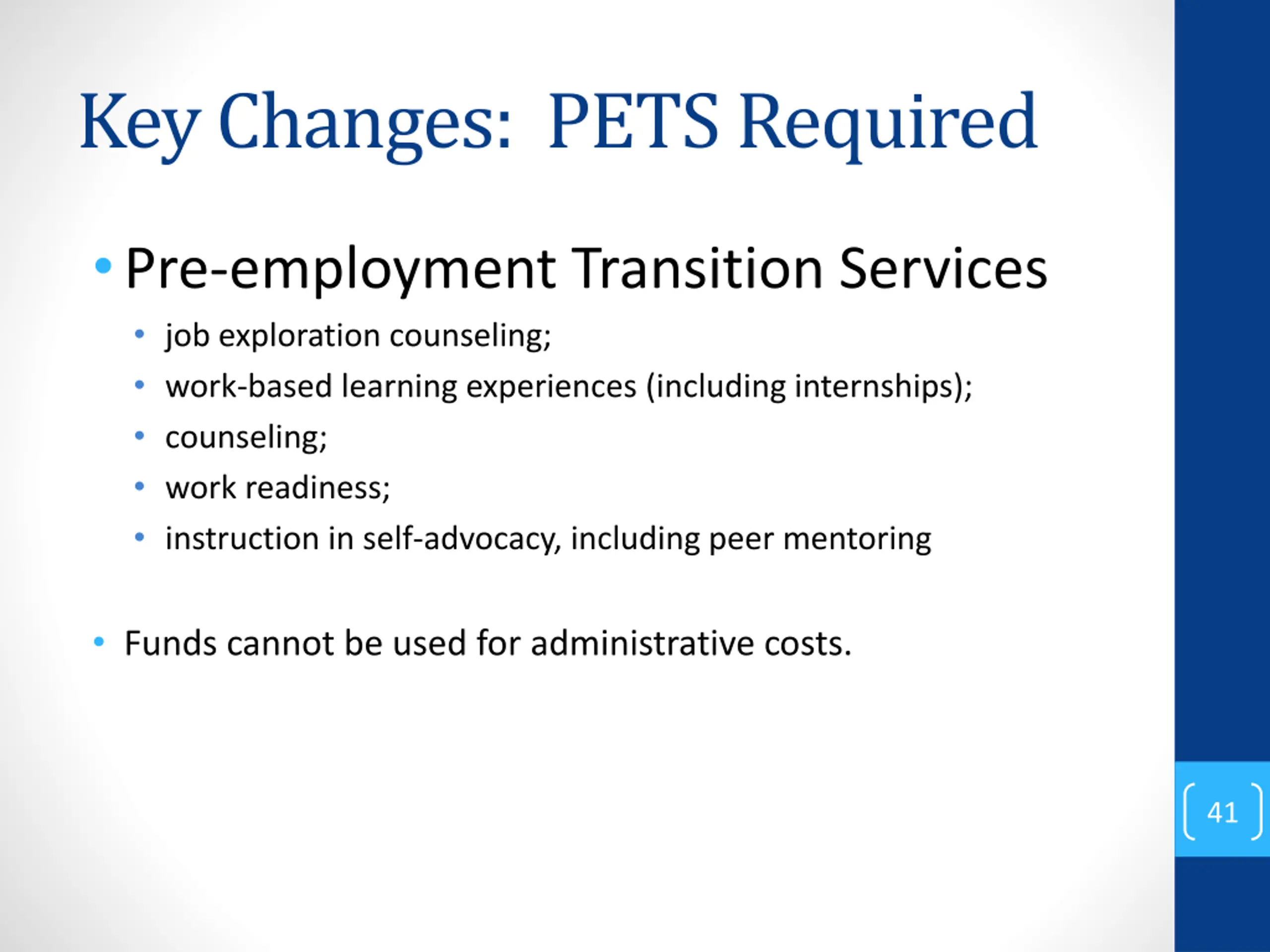 Key Changes: PETS Required Pre-employment Transition Services job exploration counseling; work-based learning experiences (including internships); counseling; work readiness; instruction in self-advocacy, including peer mentoring Funds cannot be used for administrative costs. 41