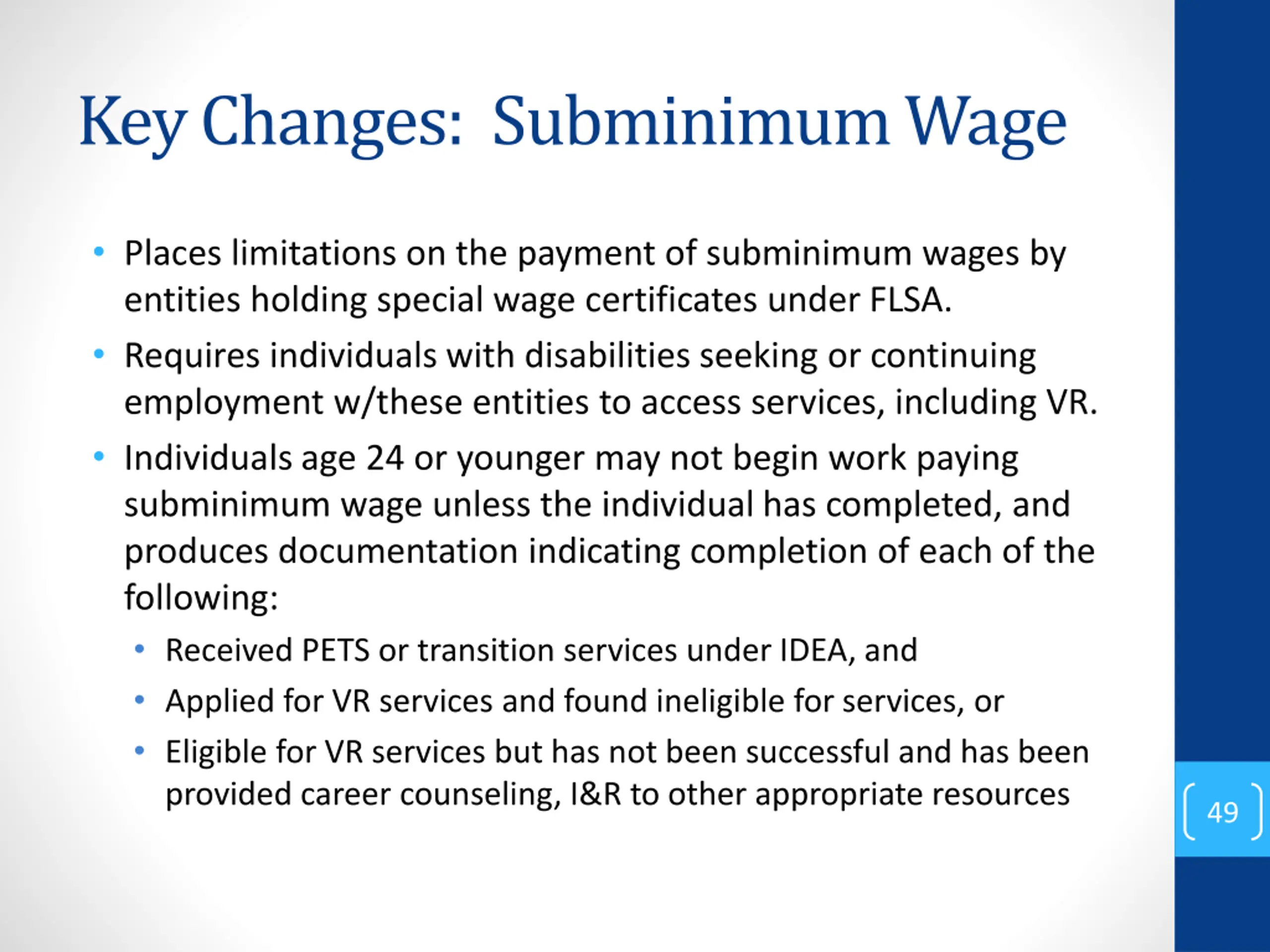 Key Changes: Subminimum Wage Places limitations on the payment of subminimum wages by entities holding special wage certificates under FLSA. Requires individuals with disabilities seeking or continuing employment w/these entities to access services, including VR. Individuals age 24 or younger may not begin work paying subminimum wage unless the individual has completed, and produces documentation indicating completion of each of the following: Received PETS or transition services under IDEA, and Applied for VR services and found ineligible for services, or Eligible for VR services but has not been successful and has been provided career counseling, I&R to other appropriate resources 49