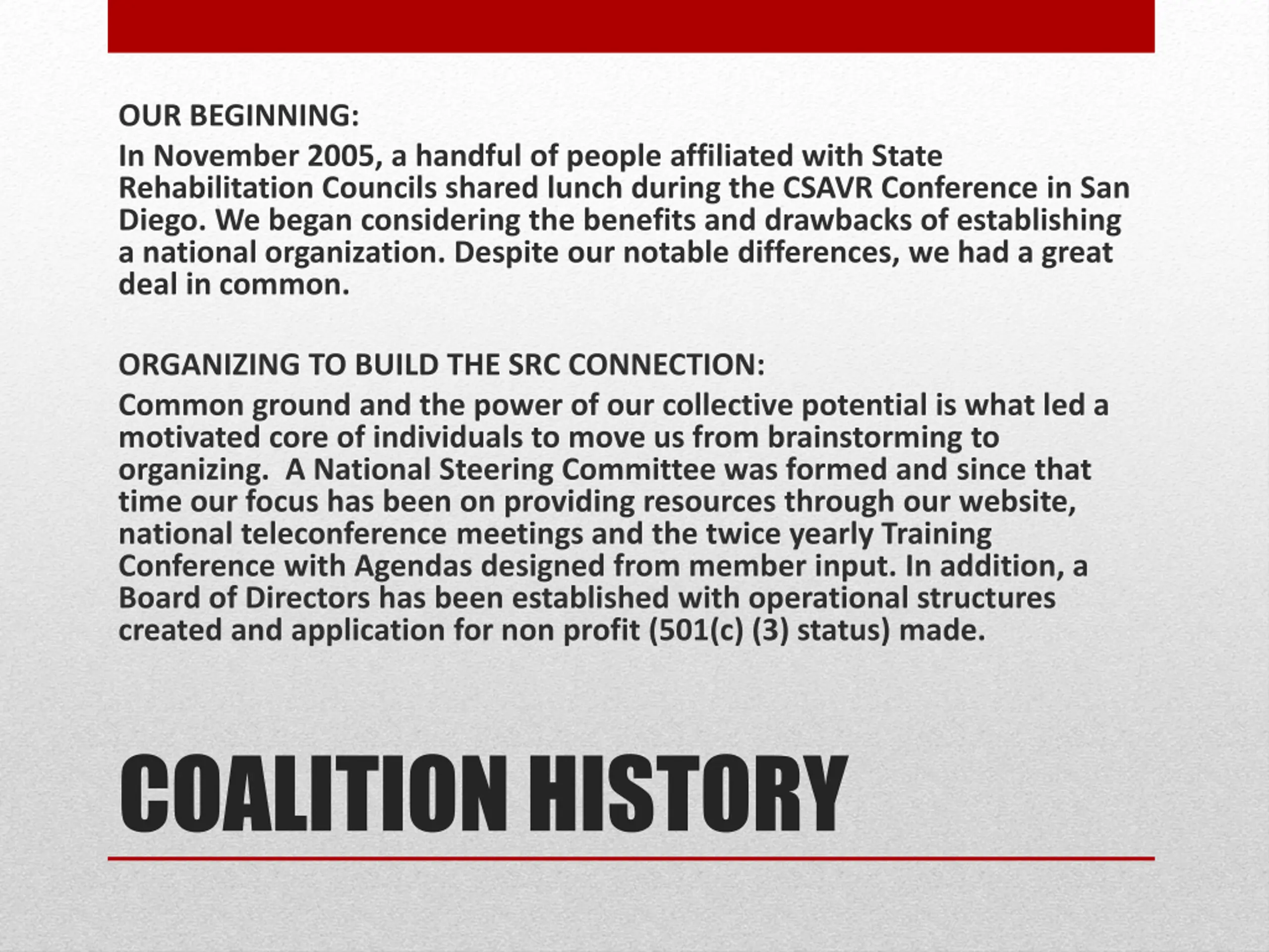 OUR BEGINNING: In November 2005, a handful of people affiliated with State Rehabilitation Councils shared lunch during the CSAVR Conference in San Diego. We began considering the benefits and drawbacks of establishing a national organization. Despite our notable differences, we had a great deal in common. ORGANIZING TO BUILD THE SRC CONNECTION: Common ground and the power of our collective potential is what led a motivated core of individuals to move us from brainstorming to organizing. A National Steering Committee was formed and since that time our focus has been on providing resources through our website, national teleconference meetings and the twice yearly Training Conference with Agendas designed from member input. In addition, a Board of Directors has been established with operational structures created and application for non profit (501(c) (3) status) made. COALITION HISTORY
