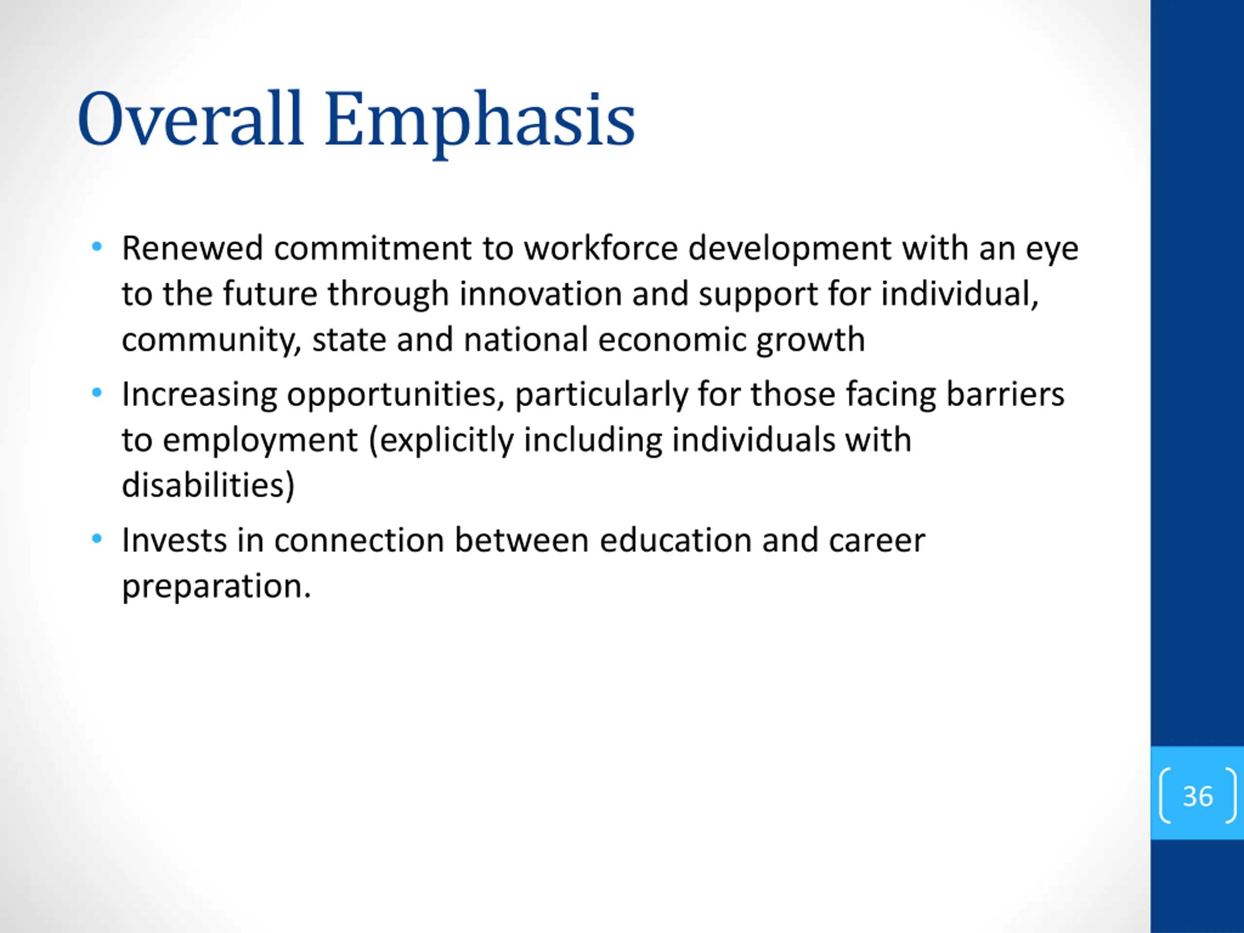 Overall Emphasis Renewed commitment to workforce development with an eye to the future through innovation and support for individual, community, state and national economic growth Increasing opportunities, particularly for those facing barriers to employment (explicitly including individuals with disabilities) Invests in connection between education and career preparation. 36