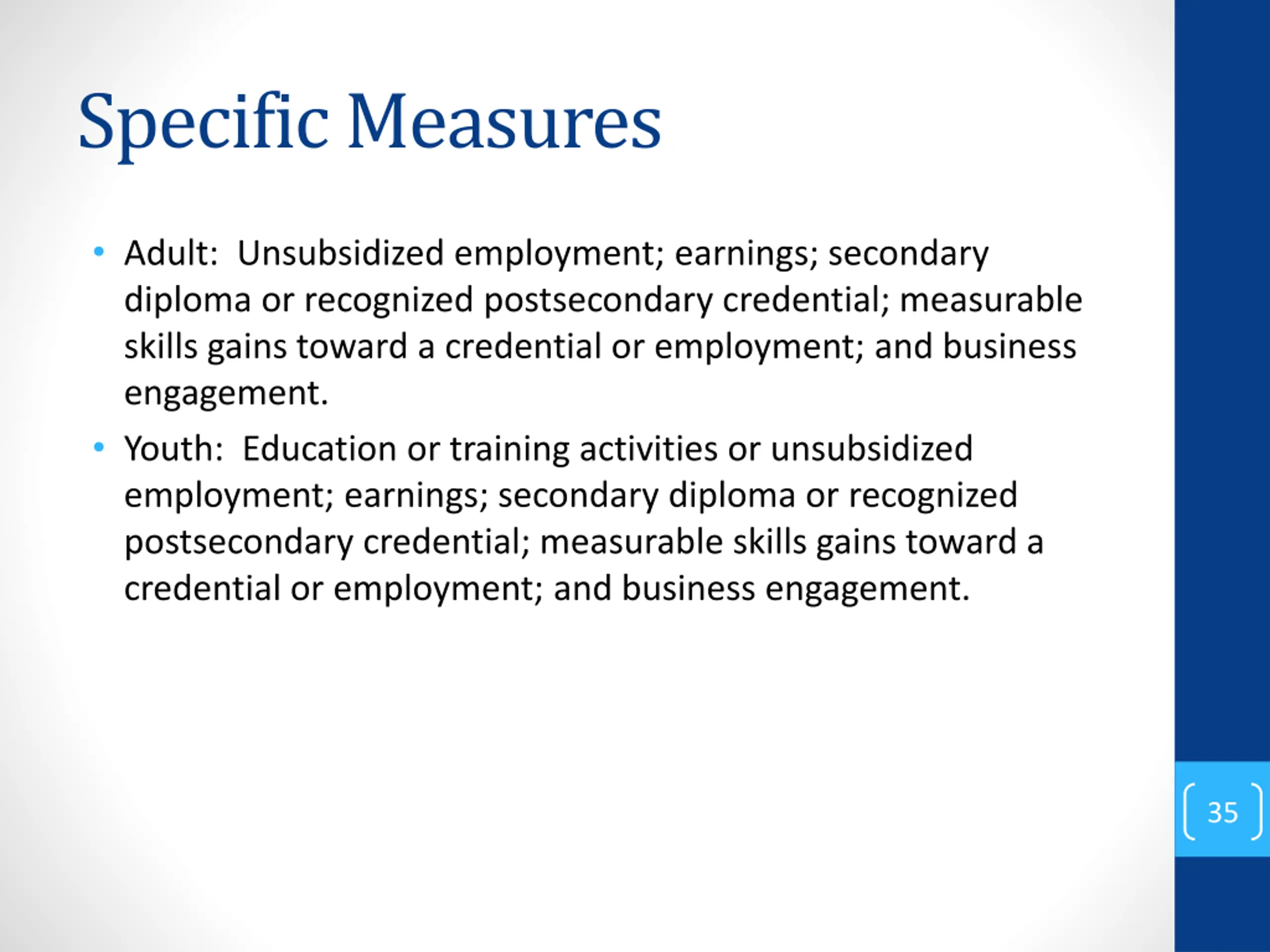 Specific Measures Adult: Unsubsidized employment; earnings; secondary diploma or recognized postsecondary credential; measurable skills gains toward a credential or employment; and business engagement. Youth: Education or training activities or unsubsidized employment; earnings; secondary diploma or recognized postsecondary credential; measurable skills gains toward a credential or employment; and business engagement. 35