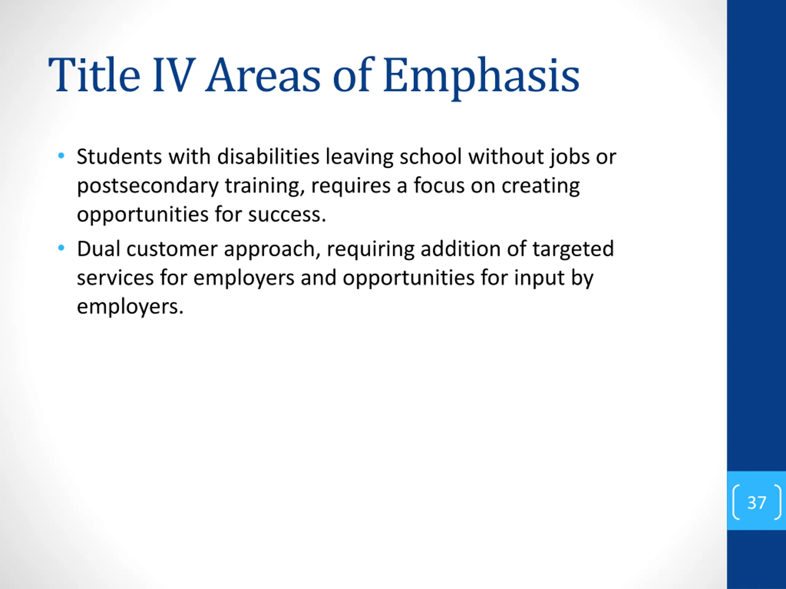 Title IV Areas of Emphasis Students with disabilities leaving school without jobs or postsecondary training, requires a focus on creating opportunities for success. Dual customer approach, requiring addition of targeted services for employers and opportunities for input by employers. 37