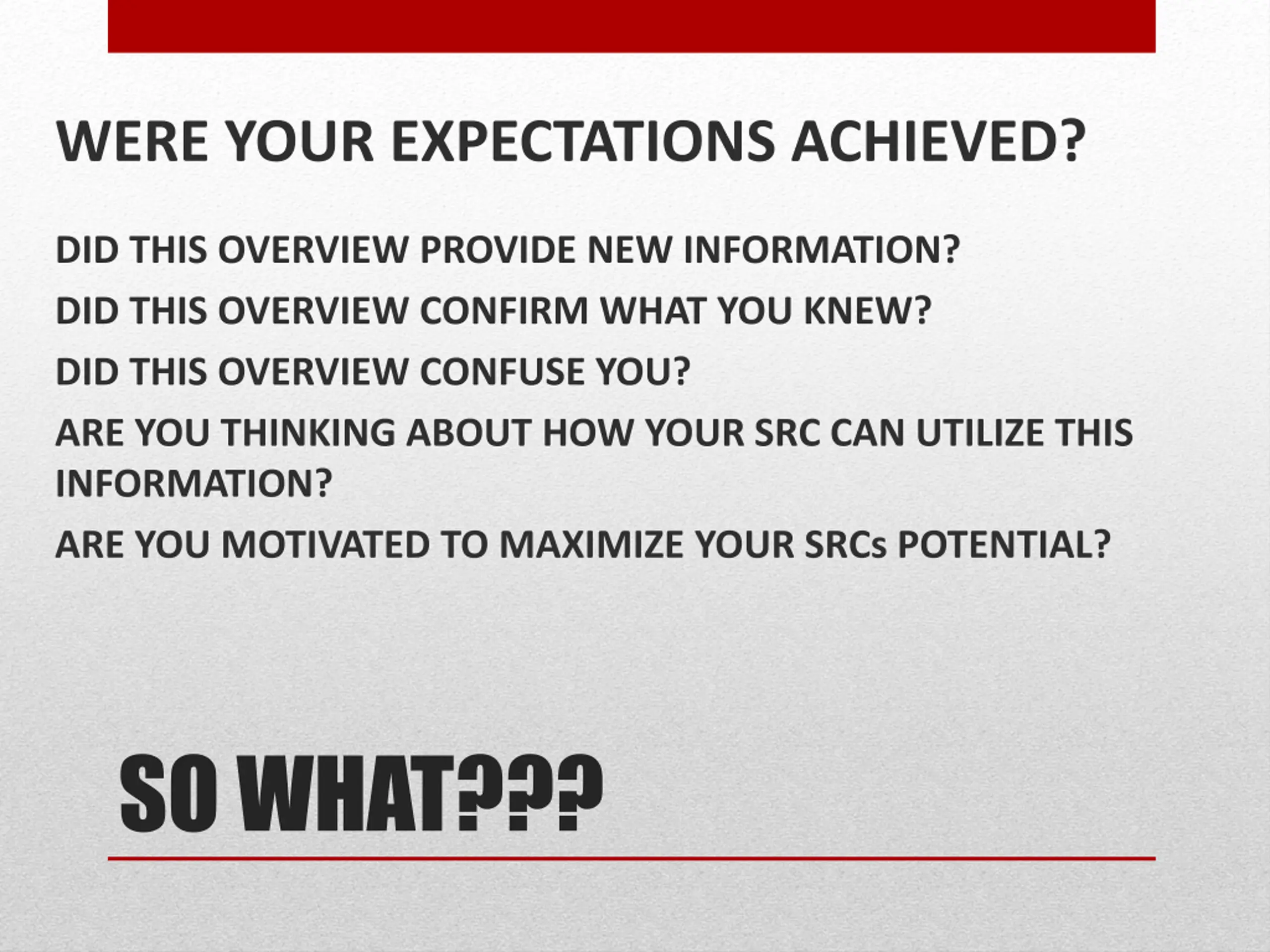 WERE YOUR EXPECTATIONS ACHIEVED? DID THIS OVERVIEW PROVIDE NEW INFORMATION? DID THIS OVERVIEW CONFIRM WHAT YOU KNEW? DID THIS OVERVIEW CONFUSE YOU? ARE YOU THINKING ABOUT HOW YOUR SRC CAN UTILIZE THIS INFORMATION? ARE YOU MOTIVATED TO MAXIMIZE YOUR SRCs POTENTIAL? SO WHAT???