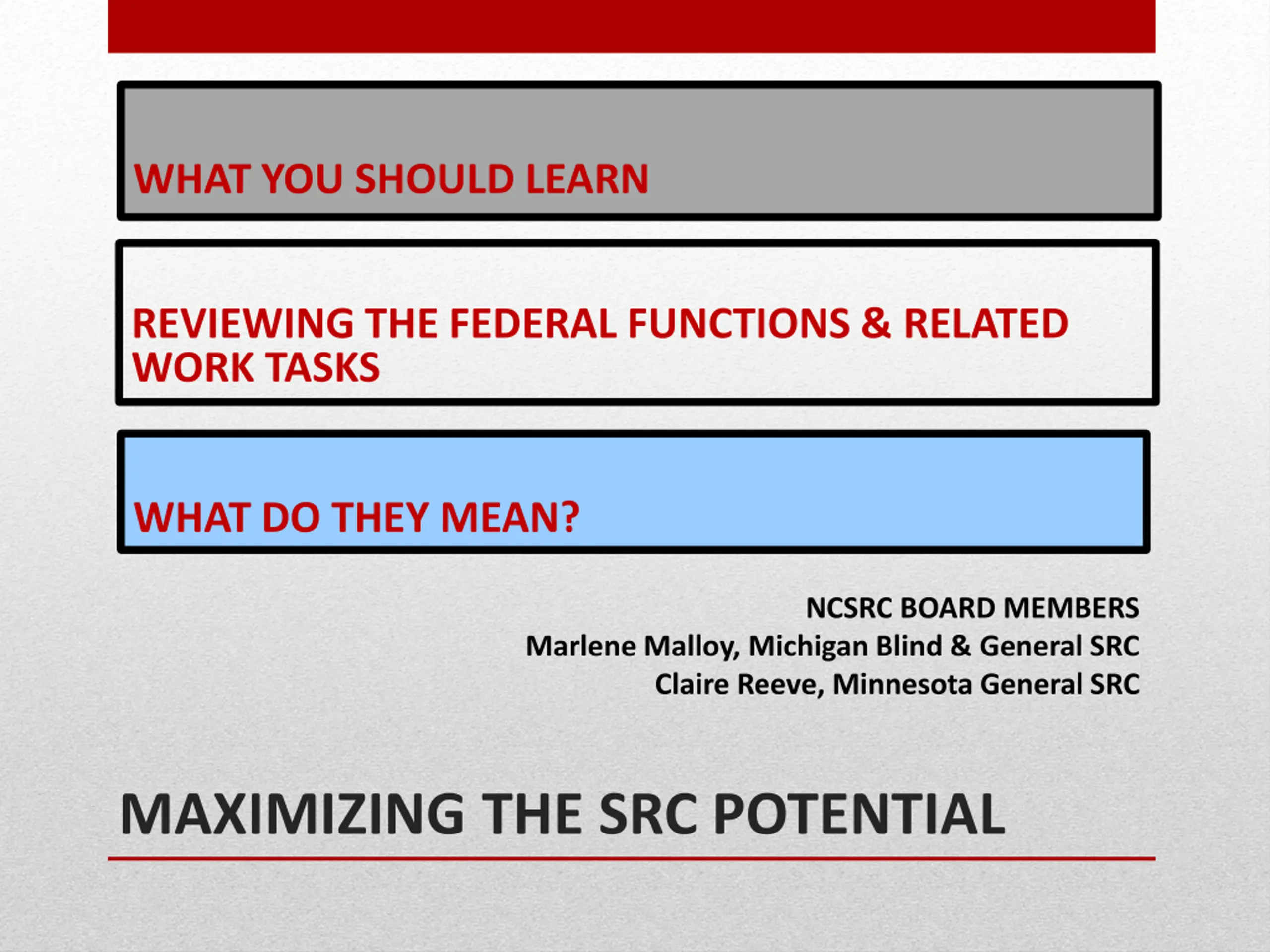 WHAT YOU SHOULD LEARN REVIEWING THE FEDERAL FUNCTIONS & RELATED WORK TASKS WHAT DO THEY MEAN? NCSRC BOARD MEMBERS Marlene Malloy, Michigan Blind & General SRC Claire Reeve, Minnesota General SRC MAXIMIZING THE SRC POTENTIAL