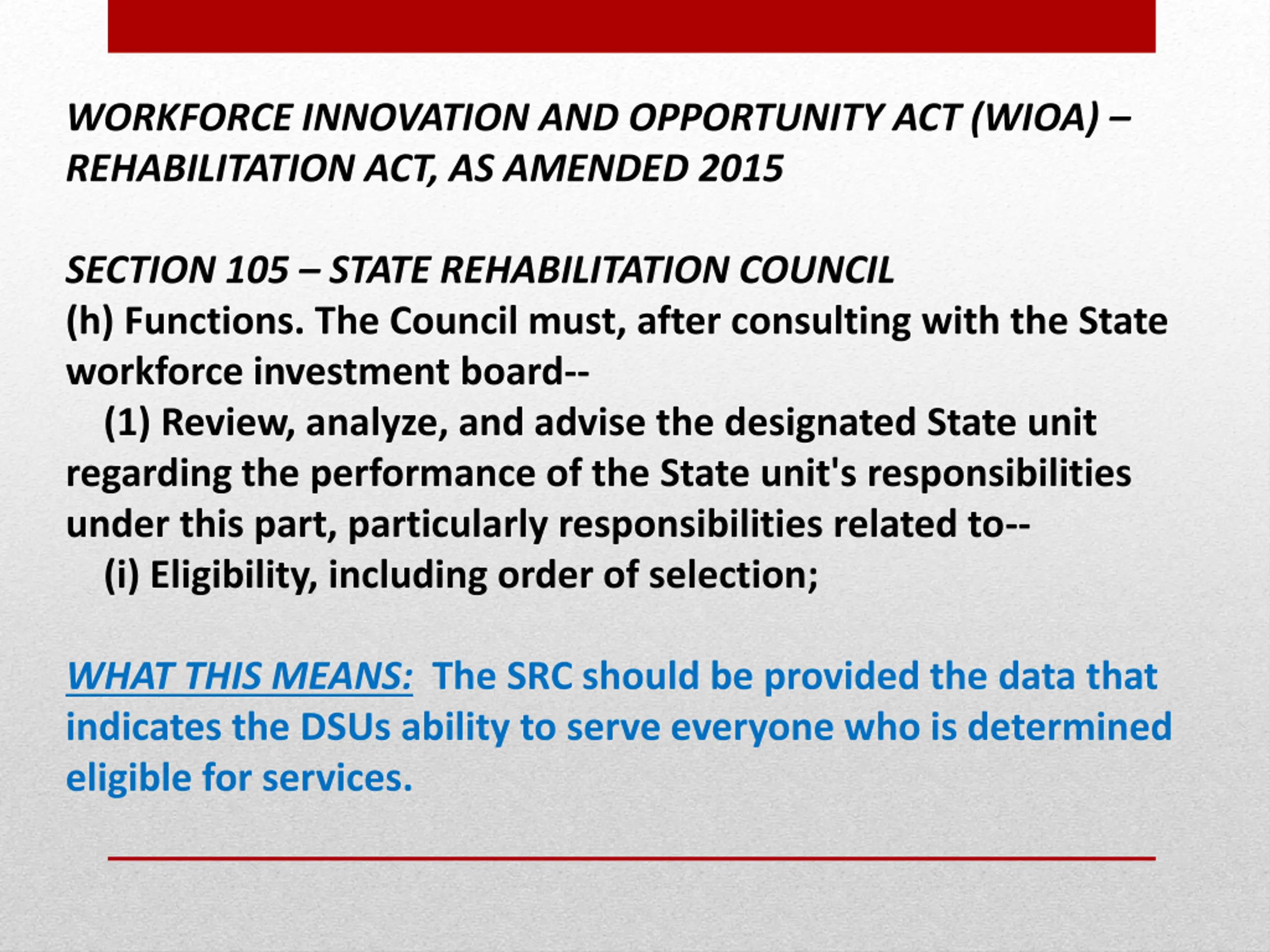 WORKFORCE INNOVATION AND OPPORTUNITY ACT (WIOA) REHABILITATION ACT, AS AMENDED 2015 SECTION 105 STATE REHABILITATION COUNCIL (h) Functions. The Council must, after consulting with the State workforce investment board-- (1) Review, analyze, and advise the designated State unit regarding the performance of the State unit's responsibilities under this part, particularly responsibilities related to-- (i) Eligibility, including order of selection; WHAT THIS MEANS: The SRC should be provided the data that indicates the DSUs ability to serve everyone who is determined eligible for services.