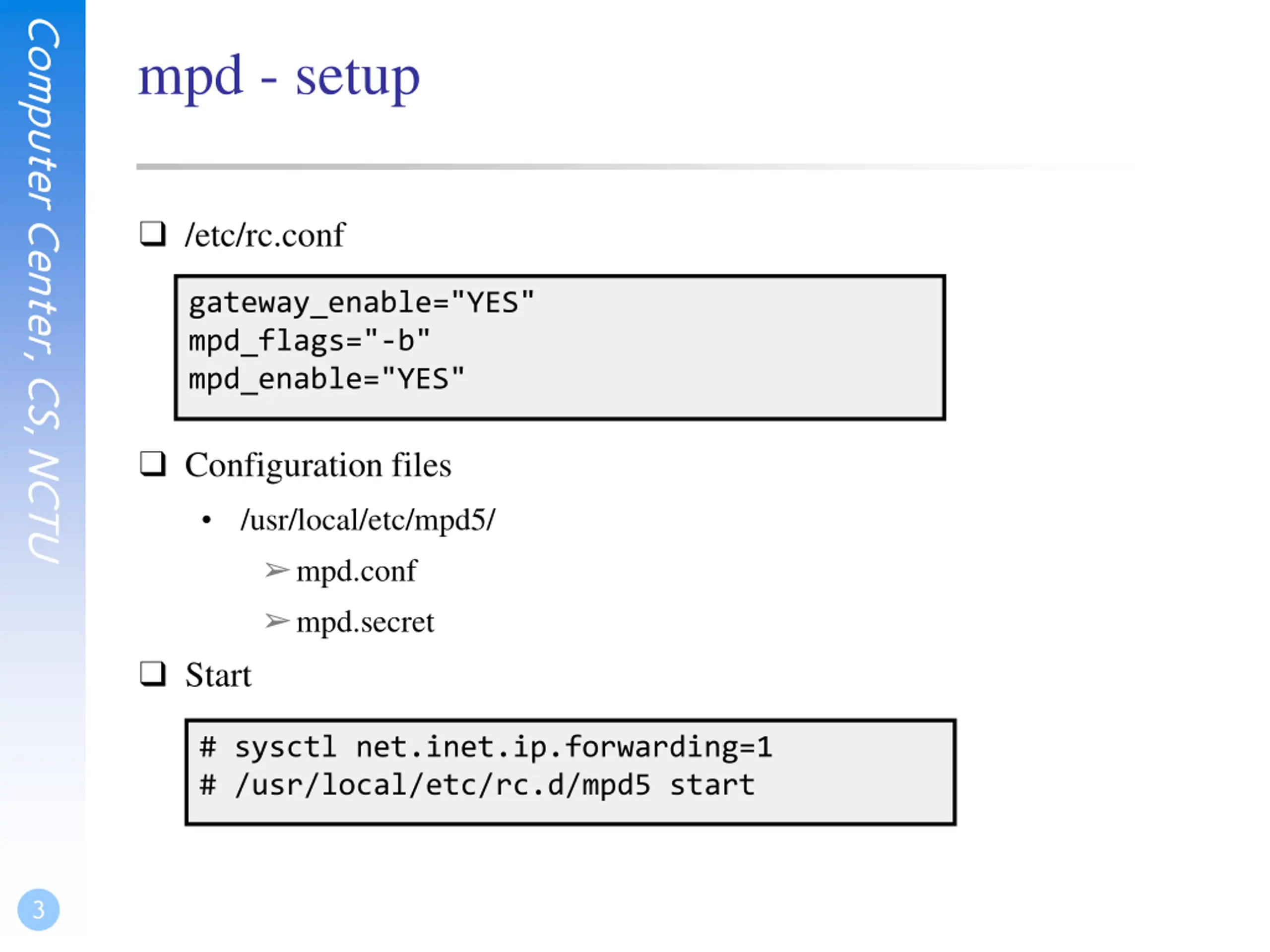 Computer Center, CS, NCTU mpd - setup /etc/rc.conf gateway_enable="YES" mpd_flags="-b" mpd_enable="YES" Configuration files /usr/local/etc/mpd5/ mpd.conf mpd.secret Start # sysctl net.inet.ip.forwarding=1 # /usr/local/etc/rc.d/mpd5 start 3