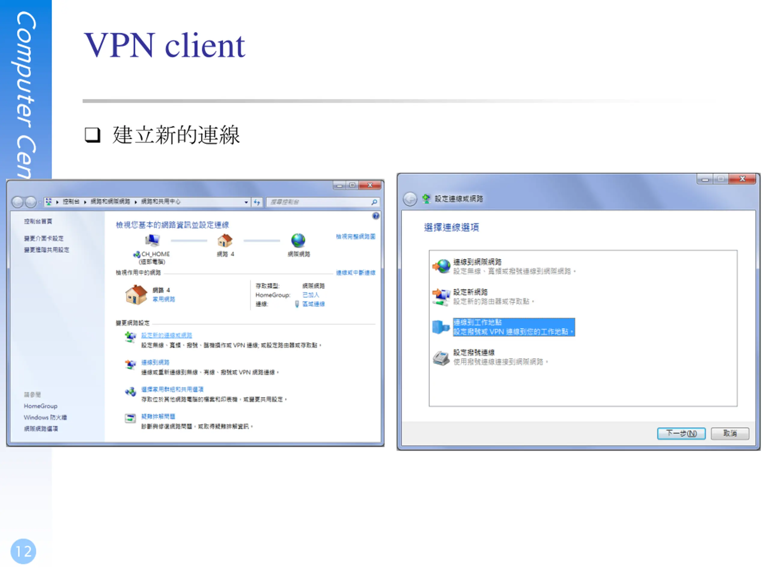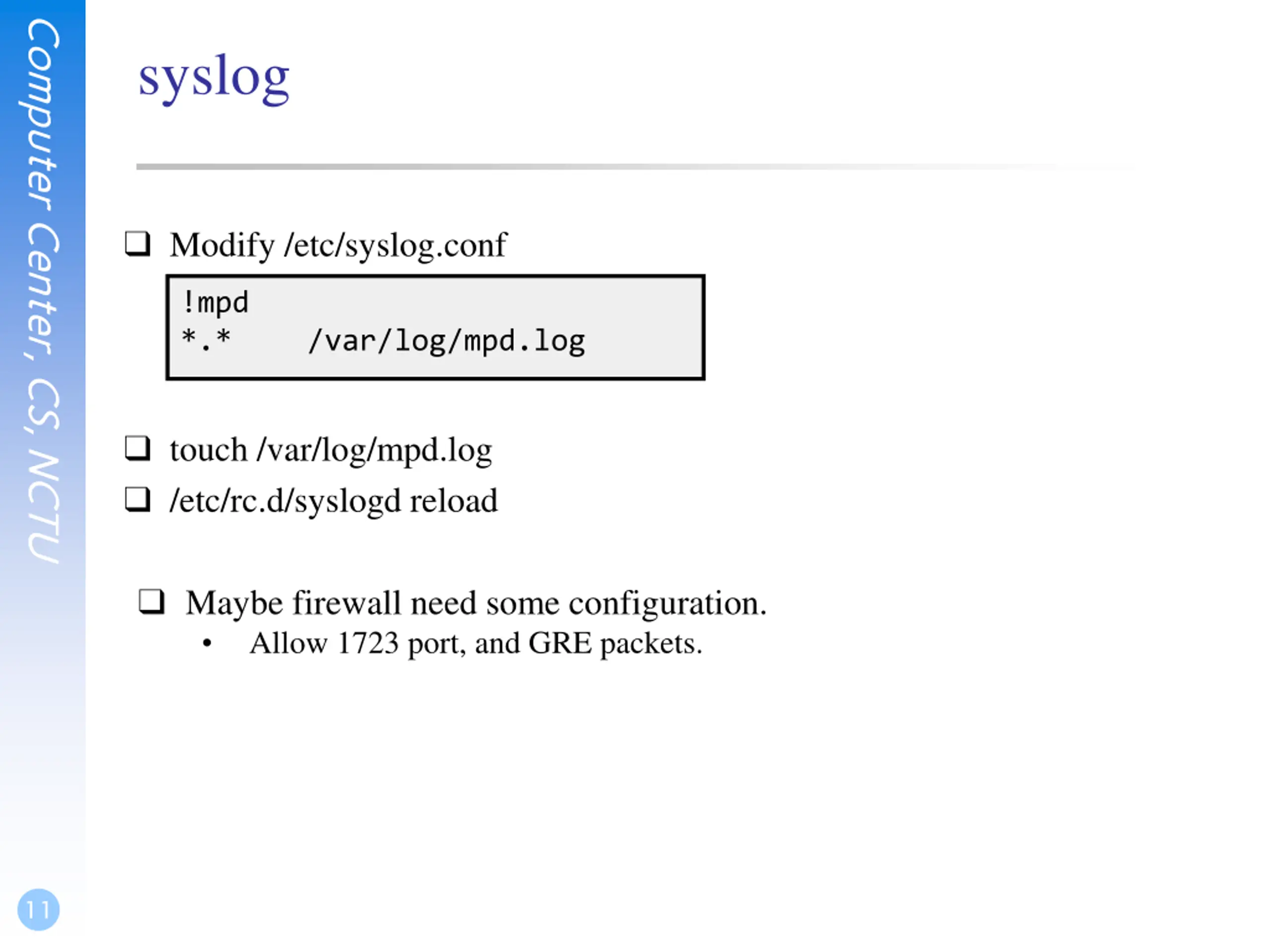 Computer Center, CS, NCTU syslog Modify /etc/syslog.conf !mpd *.* /var/log/mpd.log touch /var/log/mpd.log /etc/rc.d/syslogd reload Maybe firewall need some configuration. Allow 1723 port, and GRE packets. 11