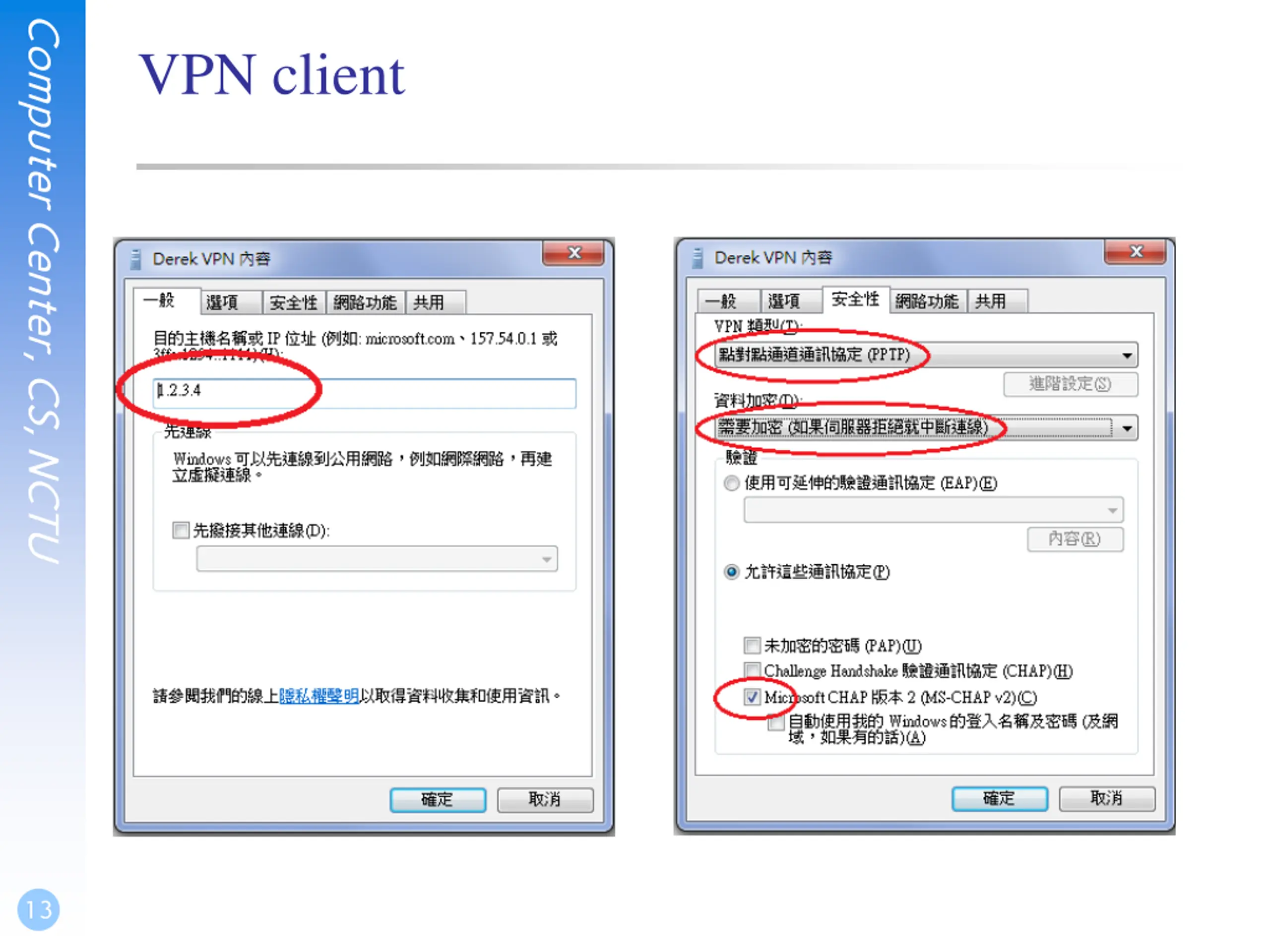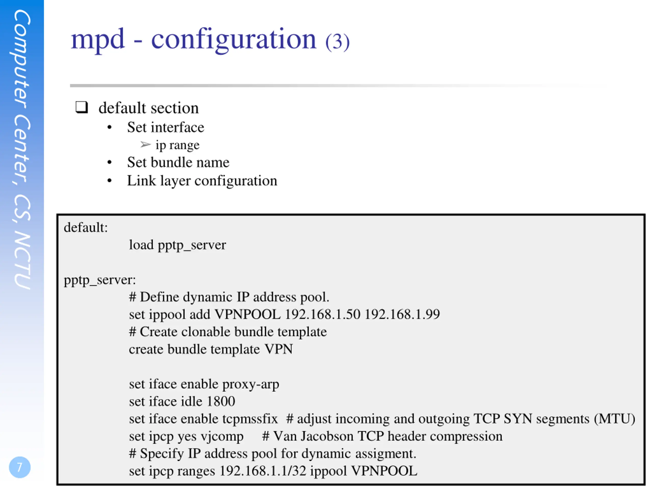 Computer Center, CS, NCTU mpd - configuration (3) default section Set interface ip range Set bundle name Link layer configuration default: load pptp_server pptp_server: # Define dynamic IP address pool. set ippool add VPNPOOL 192.168.1.50 192.168.1.99 # Create clonable bundle template create bundle template VPN set iface enable proxy-arp set iface idle 1800 set iface enable tcpmssfix # adjust incoming and outgoing TCP SYN segments (MTU) set ipcp yes vjcomp # Van Jacobson TCP header compression # Specify IP address pool for dynamic assigment. set ipcp ranges 192.168.1.1/32 ippool VPNPOOL 7