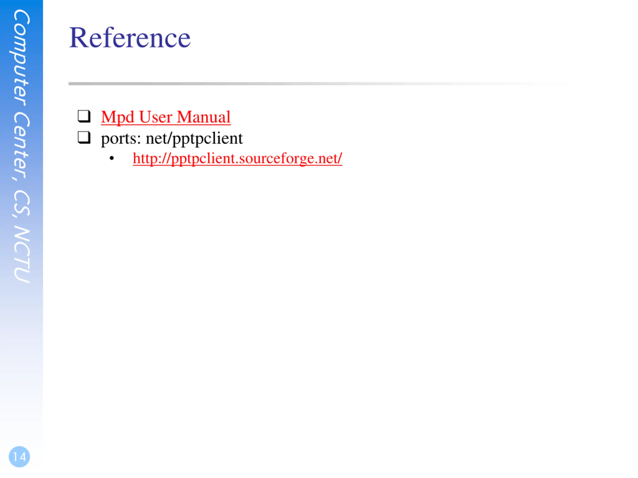 Computer Center, CS, NCTU Reference Mpd User Manual ports: net/pptpclient http://pptpclient.sourceforge.net/ 14