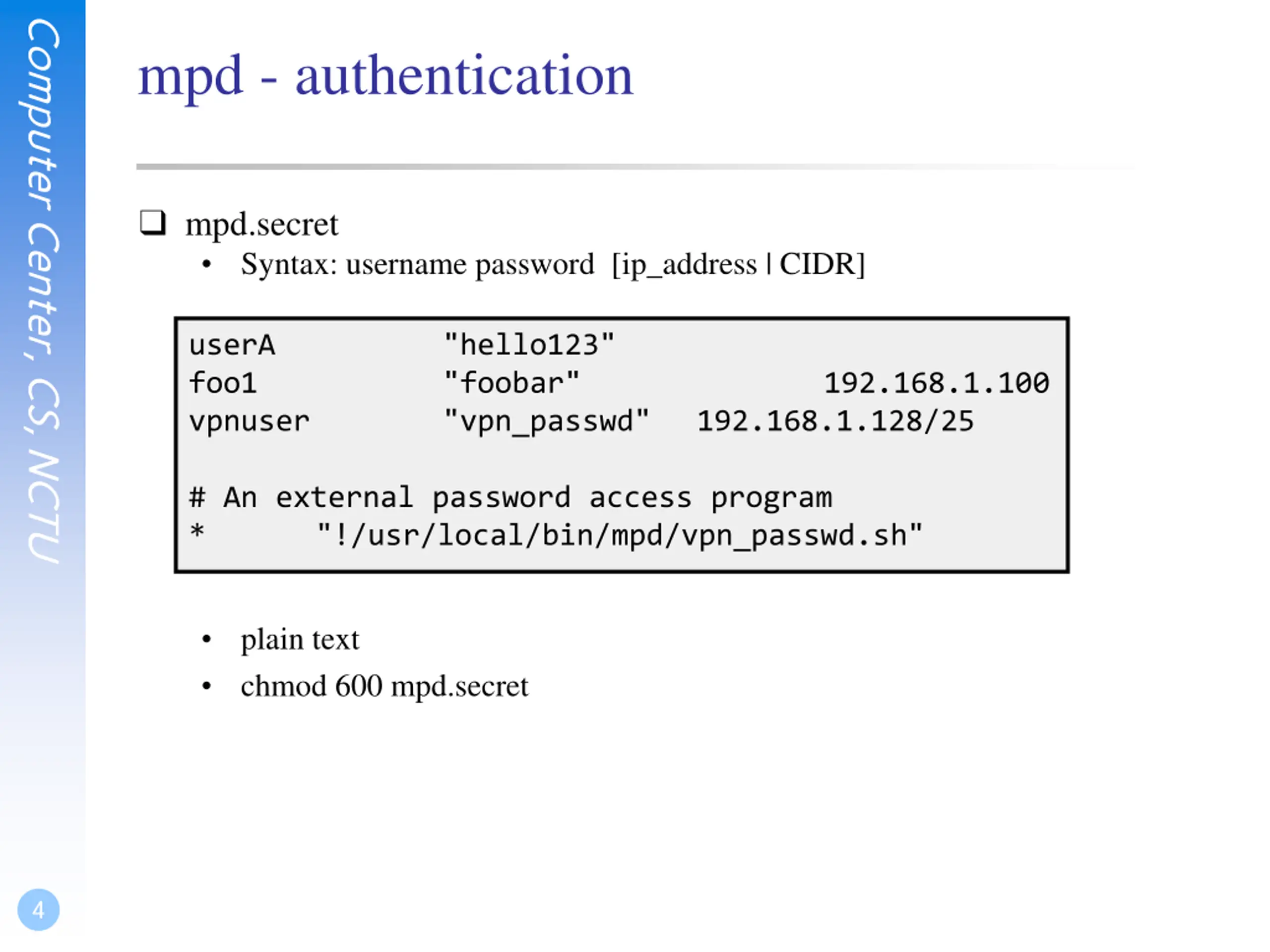 Computer Center, CS, NCTU mpd - authentication mpd.secret Syntax: username password [ip_address | CIDR] userA foo1 vpnuser "hello123" "foobar" "vpn_passwd" 192.168.1.100 192.168.1.128/25 # An external password access program * "!/usr/local/bin/mpd/vpn_passwd.sh" plain text chmod 600 mpd.secret 4