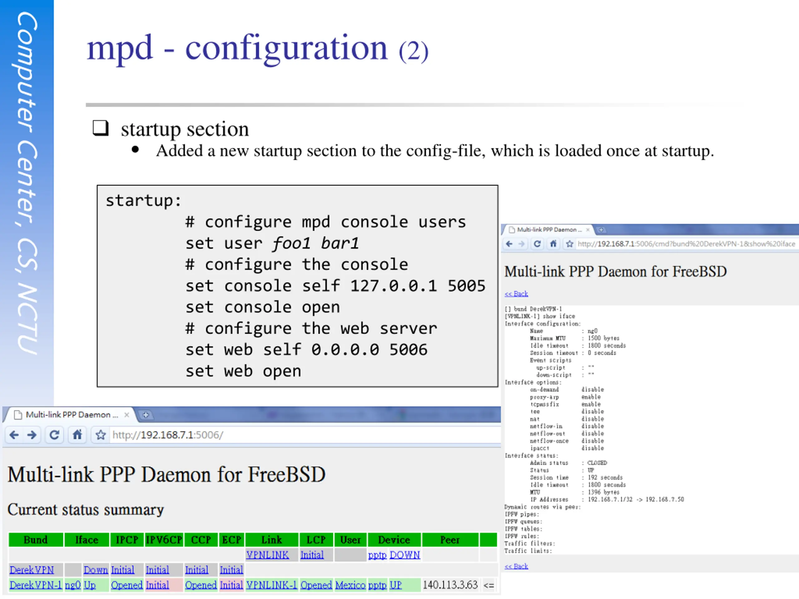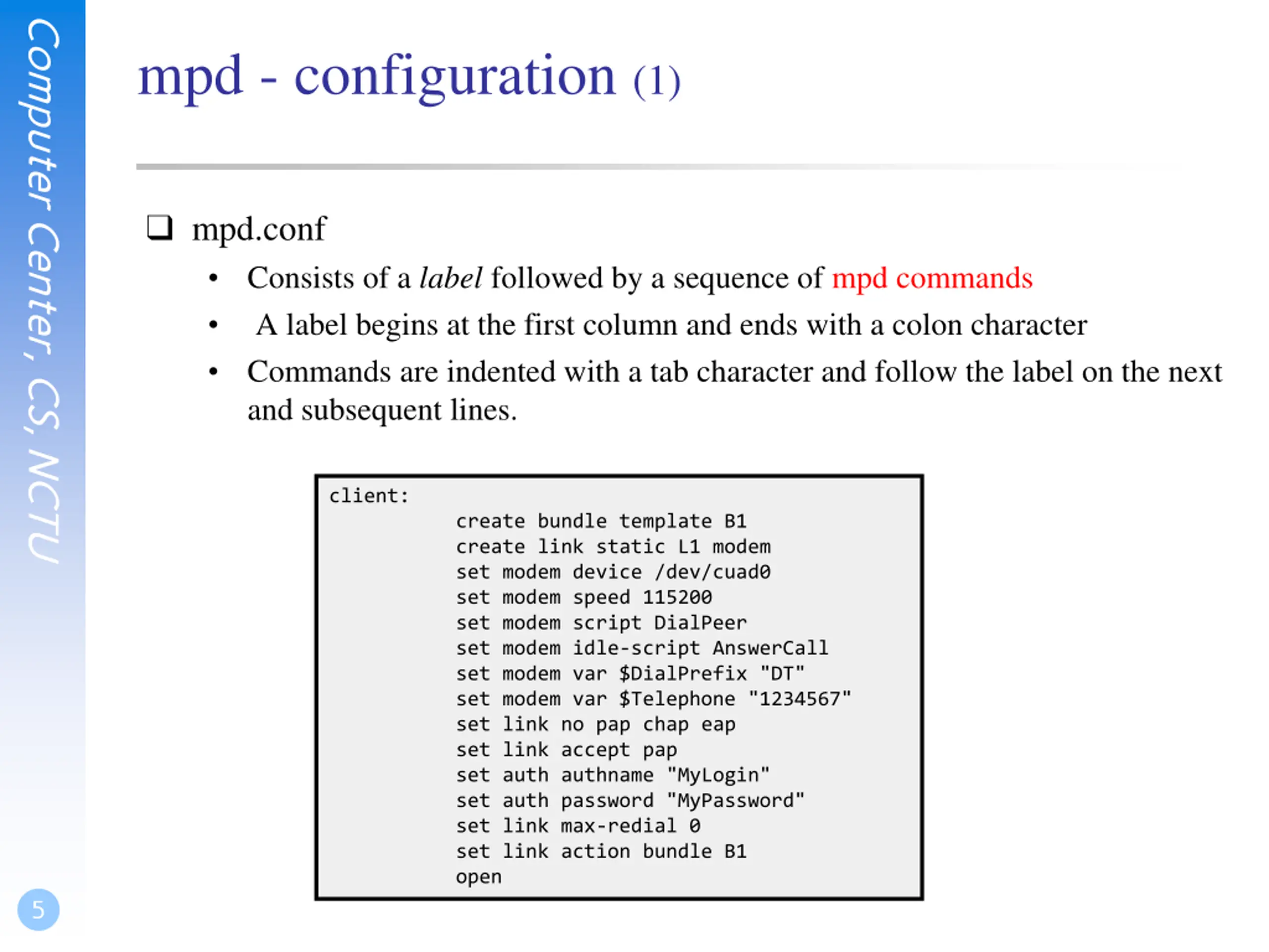 Computer Center, CS, NCTU mpd - configuration (1) mpd.conf Consists of a label followed by a sequence of mpd commands A label begins at the first column and ends with a colon character Commands are indented with a tab character and follow the label on the next and subsequent lines. client: create bundle template B1 create link static L1 modem set modem device /dev/cuad0 set modem speed 115200 set modem script DialPeer set modem idle-script AnswerCall set modem var $DialPrefix "DT" set modem var $Telephone "1234567" set link no pap chap eap set link accept pap set auth authname "MyLogin" set auth password "MyPassword" set link max-redial 0 set link action bundle B1 open 5