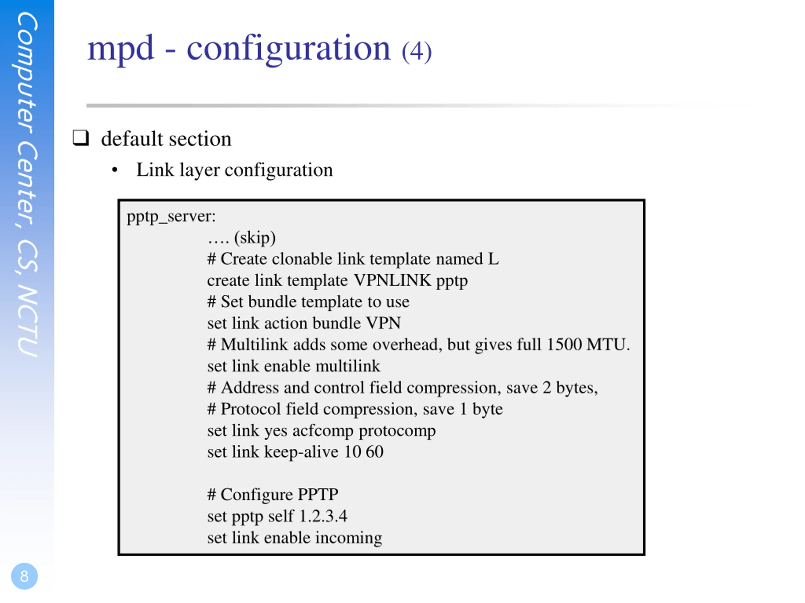 Computer Center, CS, NCTU mpd - configuration (4) default section Link layer configuration pptp_server: . (skip) # Create clonable link template named L create link template VPNLINK pptp # Set bundle template to use set link action bundle VPN # Multilink adds some overhead, but gives full 1500 MTU. set link enable multilink # Address and control field compression, save 2 bytes, # Protocol field compression, save 1 byte set link yes acfcomp protocomp set link keep-alive 10 60 # Configure PPTP set pptp self 1.2.3.4 set link enable incoming 8