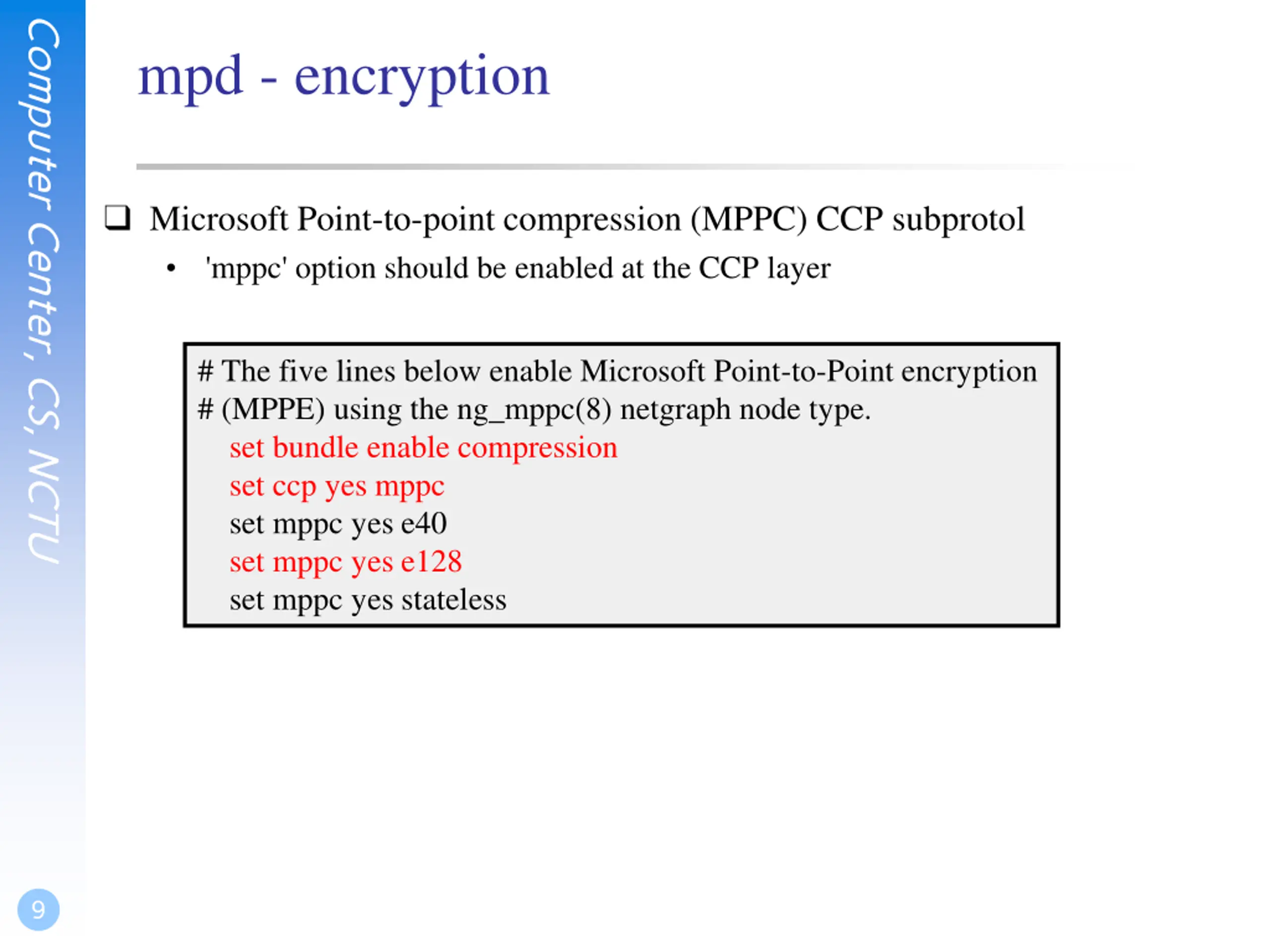 Computer Center, CS, NCTU mpd - encryption Microsoft Point-to-point compression (MPPC) CCP subprotol 'mppc' option should be enabled at the CCP layer # The five lines below enable Microsoft Point-to-Point encryption # (MPPE) using the ng_mppc(8) netgraph node type. set bundle enable compression set ccp yes mppc set mppc yes e40 set mppc yes e128 set mppc yes stateless 9