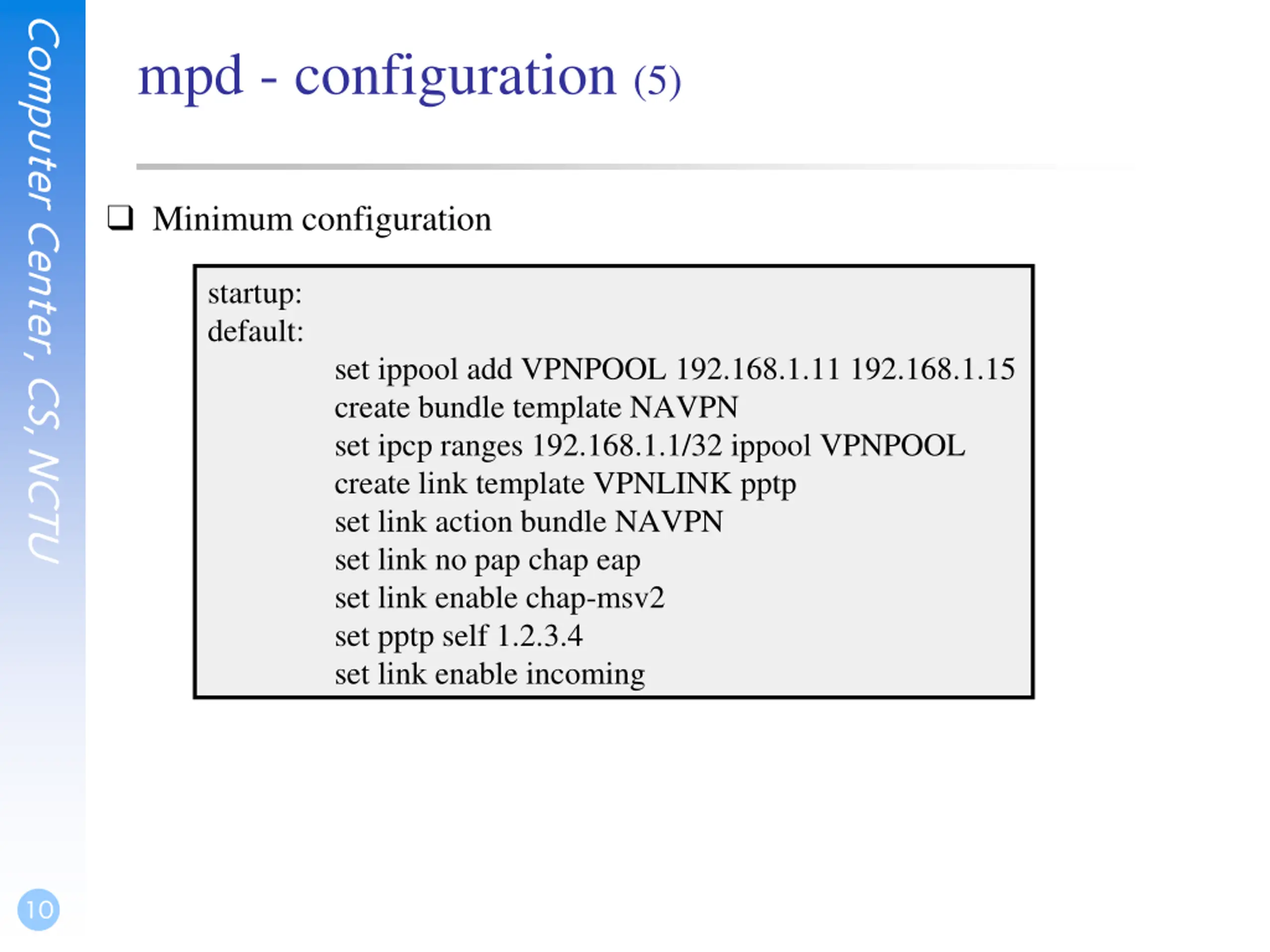 Computer Center, CS, NCTU mpd - configuration (5) Minimum configuration startup: default: set ippool add VPNPOOL 192.168.1.11 192.168.1.15 create bundle template NAVPN set ipcp ranges 192.168.1.1/32 ippool VPNPOOL create link template VPNLINK pptp set link action bundle NAVPN set link no pap chap eap set link enable chap-msv2 set pptp self 1.2.3.4 set link enable incoming 10