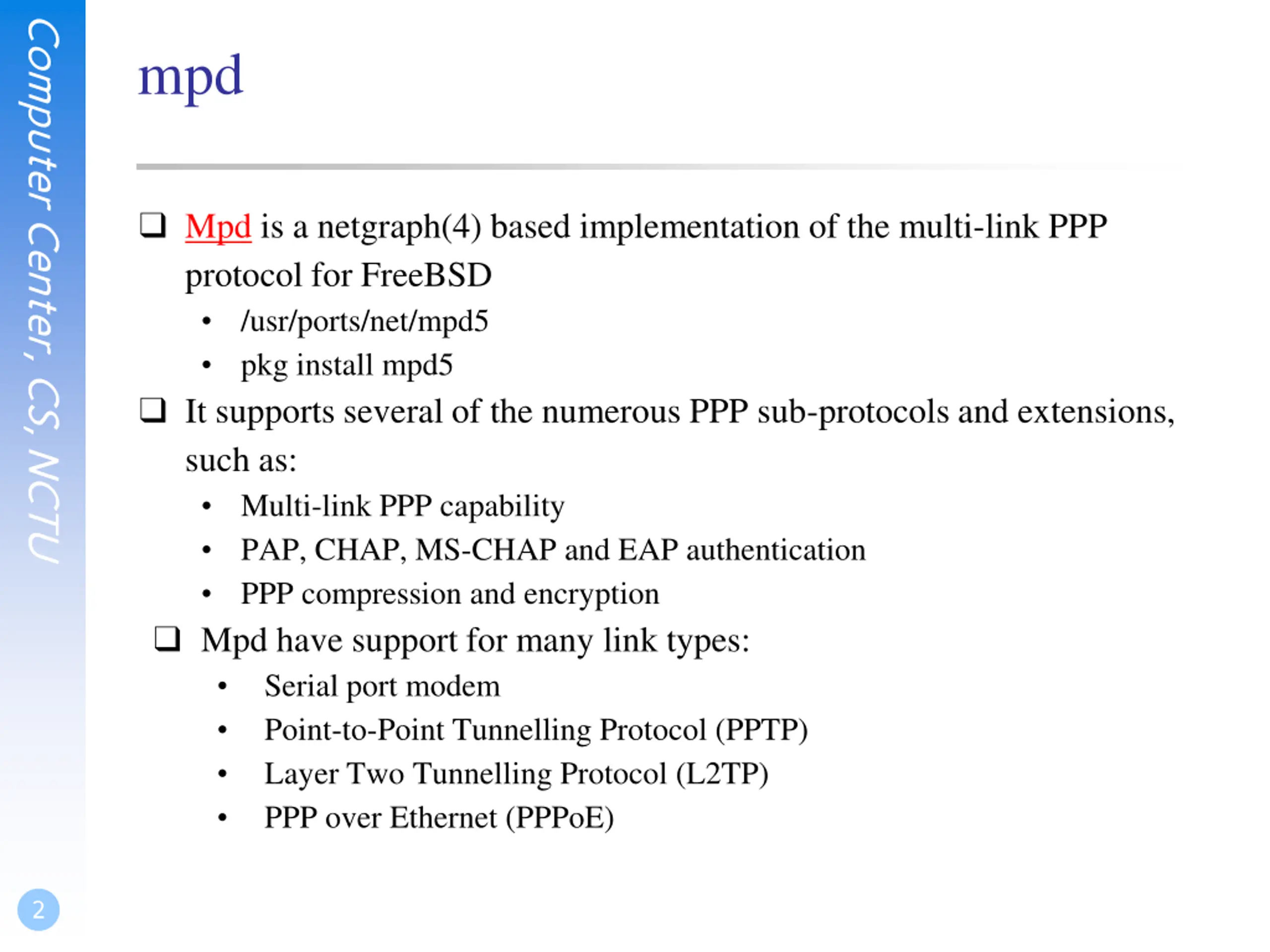 Computer Center, CS, NCTU mpd Mpd is a netgraph(4) based implementation of the multi-link PPP protocol for FreeBSD /usr/ports/net/mpd5 pkg install mpd5 It supports several of the numerous PPP sub-protocols and extensions, such as: Multi-link PPP capability PAP, CHAP, MS-CHAP and EAP authentication PPP compression and encryption Mpd have support for many link types: Serial port modem Point-to-Point Tunnelling Protocol (PPTP) Layer Two Tunnelling Protocol (L2TP) PPP over Ethernet (PPPoE) 2