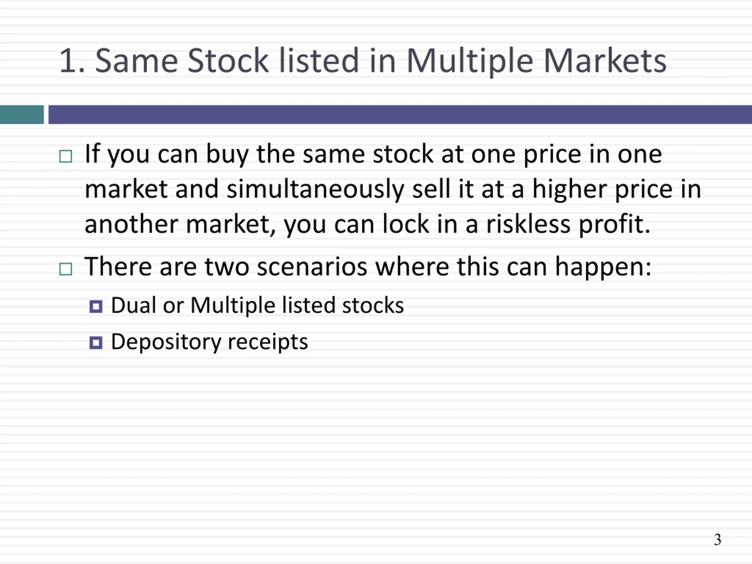 1. Same Stock listed in Multiple Markets If you can buy the same stock at one price in one market and simultaneously sell it at a higher price in another market, you can lock in a riskless profit. There are two scenarios where this can happen: Dual or Multiple listed stocks Depository receipts 3