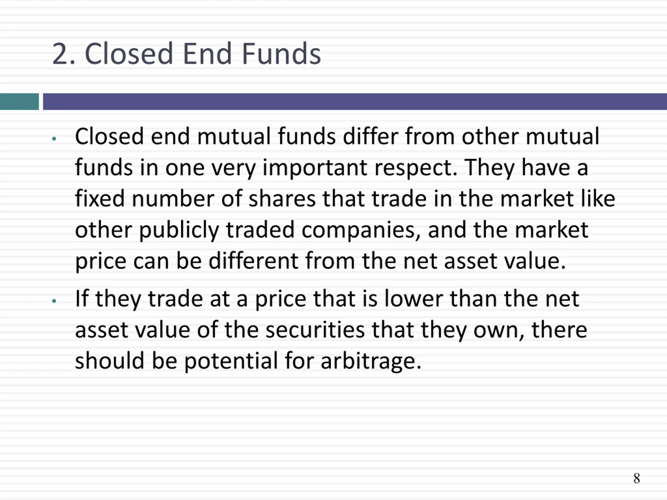 2. Closed End Funds Closed end mutual funds differ from other mutual funds in one very important respect. They have a fixed number of shares that trade in the market like other publicly traded companies, and the market price can be different from the net asset value. If they trade at a price that is lower than the net asset value of the securities that they own, there should be potential for arbitrage. 8