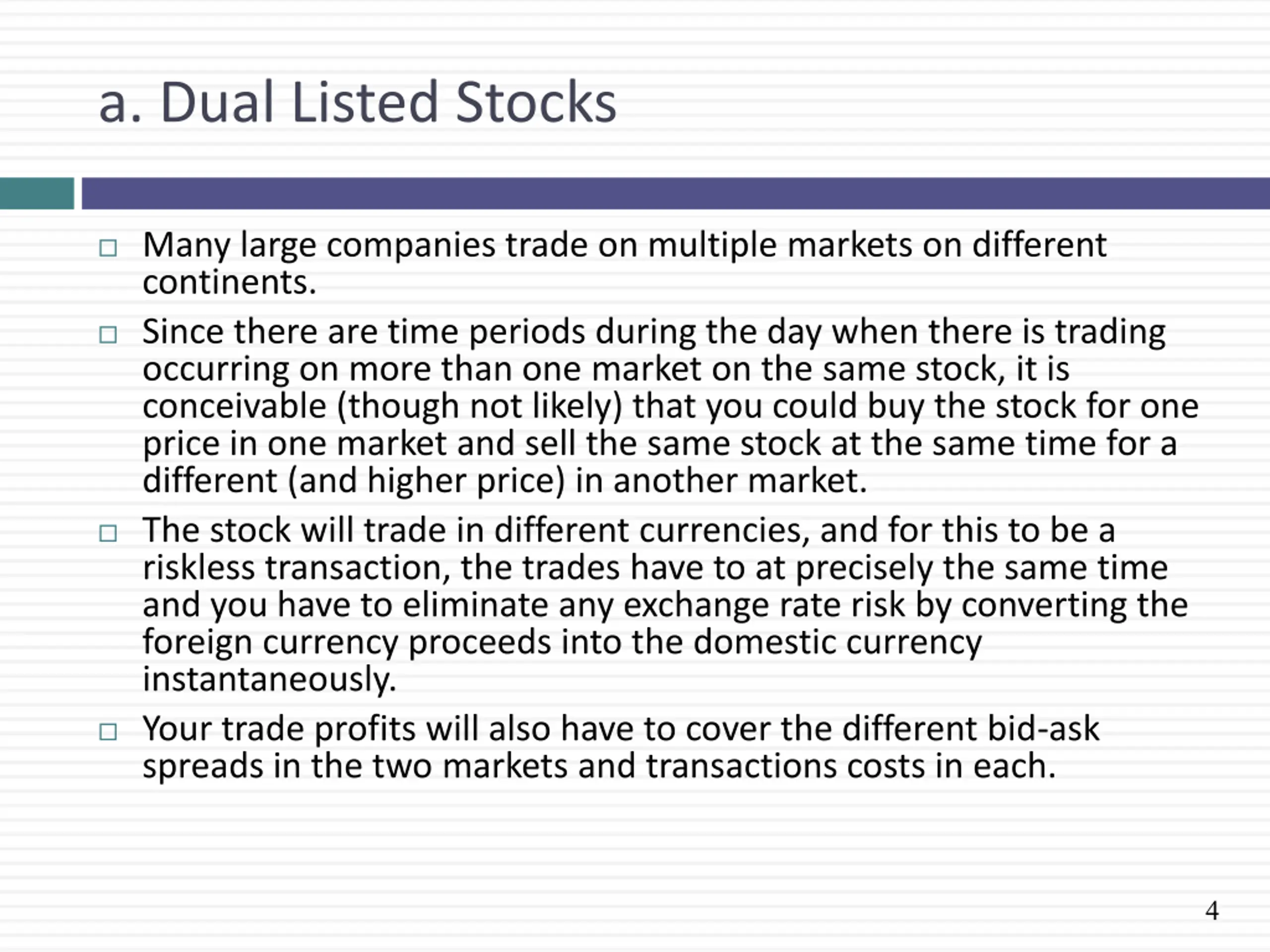 a. Dual Listed Stocks Many large companies trade on multiple markets on different continents. Since there are time periods during the day when there is trading occurring on more than one market on the same stock, it is conceivable (though not likely) that you could buy the stock for one price in one market and sell the same stock at the same time for a different (and higher price) in another market. The stock will trade in different currencies, and for this to be a riskless transaction, the trades have to at precisely the same time and you have to eliminate any exchange rate risk by converting the foreign currency proceeds into the domestic currency instantaneously. Your trade profits will also have to cover the different bid-ask spreads in the two markets and transactions costs in each. 4