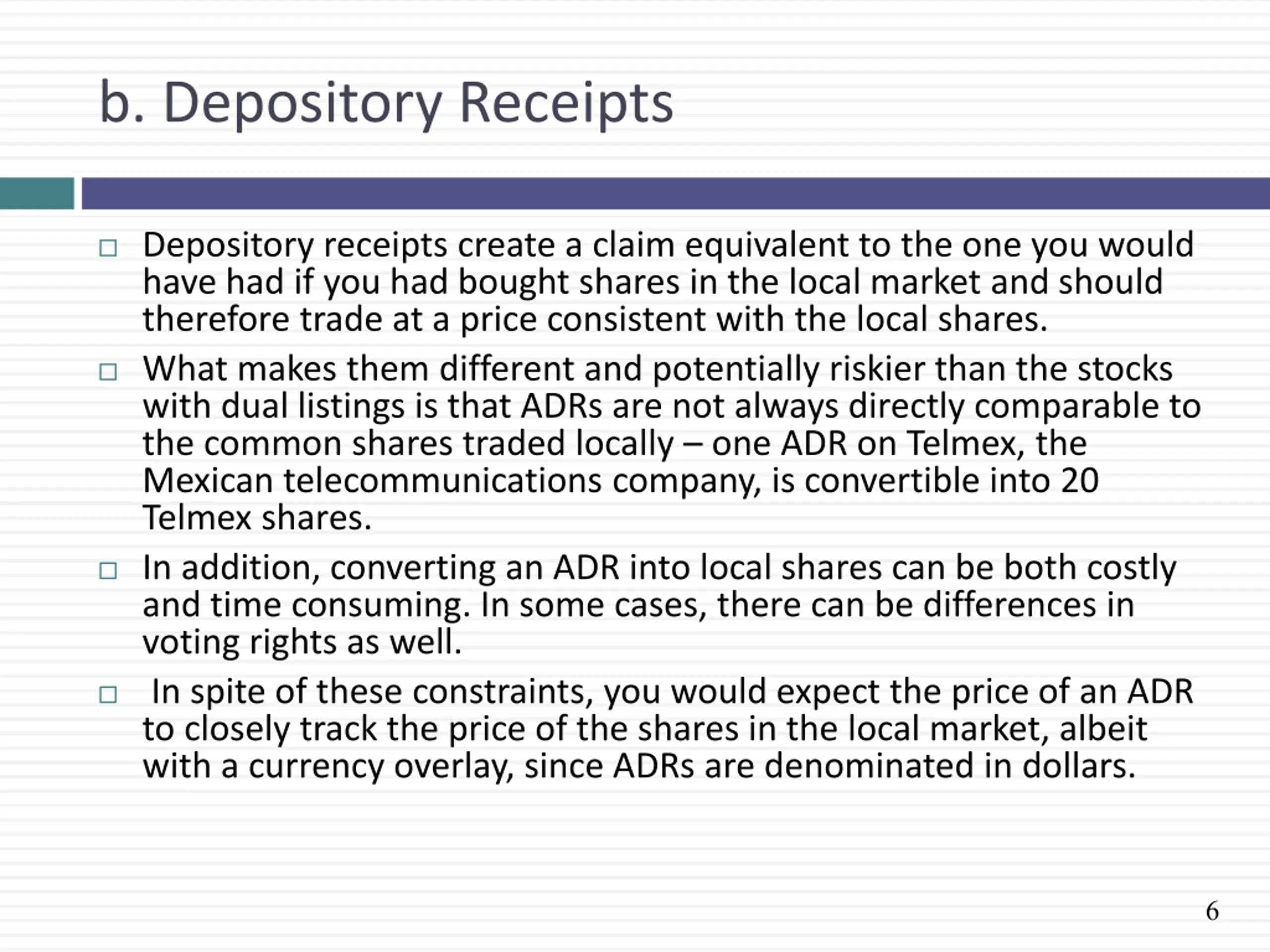 b. Depository Receipts Depository receipts create a claim equivalent to the one you would have had if you had bought shares in the local market and should therefore trade at a price consistent with the local shares. What makes them different and potentially riskier than the stocks with dual listings is that ADRs are not always directly comparable to the common shares traded locally one ADR on Telmex, the Mexican telecommunications company, is convertible into 20 Telmex shares. In addition, converting an ADR into local shares can be both costly and time consuming. In some cases, there can be differences in voting rights as well. In spite of these constraints, you would expect the price of an ADR to closely track the price of the shares in the local market, albeit with a currency overlay, since ADRs are denominated in dollars. 6
