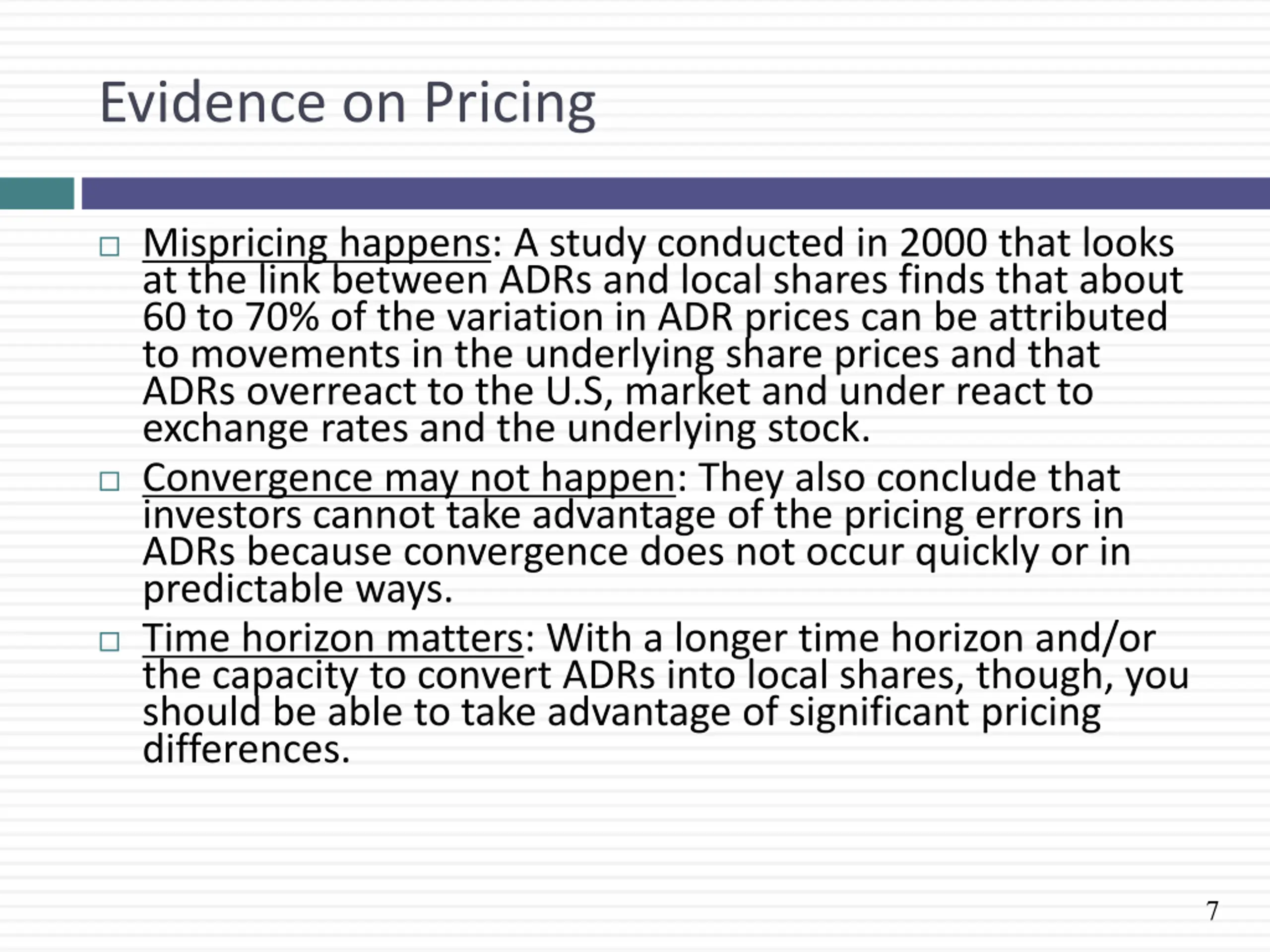 Evidence on Pricing Mispricing happens: A study conducted in 2000 that looks at the link between ADRs and local shares finds that about 60 to 70% of the variation in ADR prices can be attributed to movements in the underlying share prices and that ADRs overreact to the U.S, market and under react to exchange rates and the underlying stock. Convergence may not happen: They also conclude that investors cannot take advantage of the pricing errors in ADRs because convergence does not occur quickly or in predictable ways. Time horizon matters: With a longer time horizon and/or the capacity to convert ADRs into local shares, though, you should be able to take advantage of significant pricing differences. 7