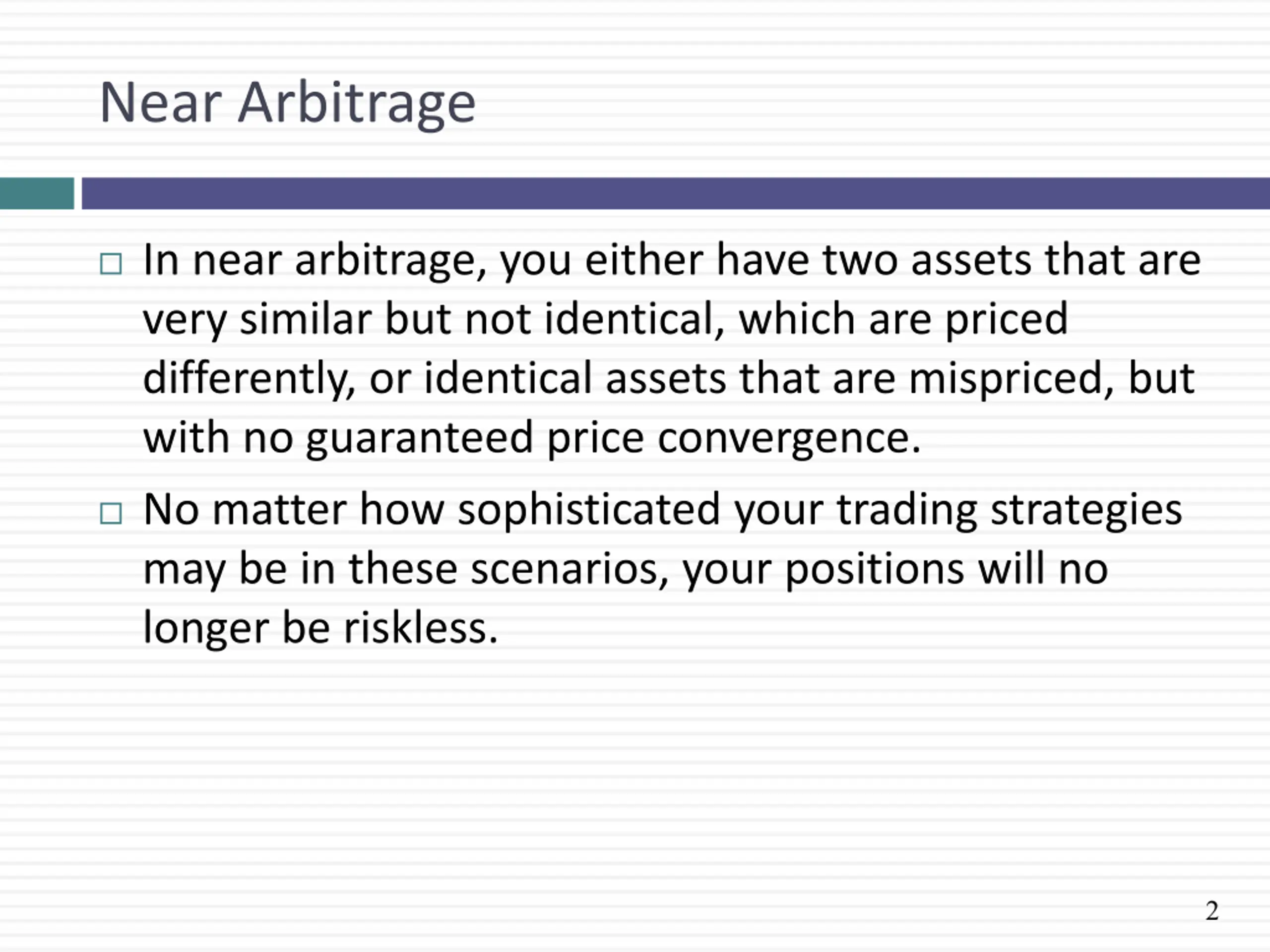 Near Arbitrage In near arbitrage, you either have two assets that are very similar but not identical, which are priced differently, or identical assets that are mispriced, but with no guaranteed price convergence. No matter how sophisticated your trading strategies may be in these scenarios, your positions will no longer be riskless. 2