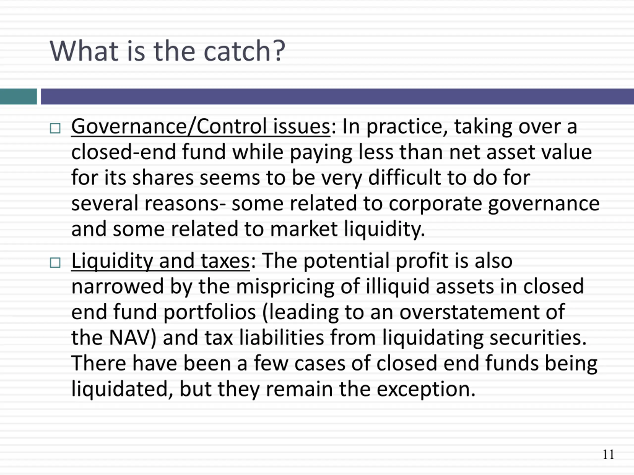 What is the catch? Governance/Control issues: In practice, taking over a closed-end fund while paying less than net asset value for its shares seems to be very difficult to do for several reasons- some related to corporate governance and some related to market liquidity. Liquidity and taxes: The potential profit is also narrowed by the mispricing of illiquid assets in closed end fund portfolios (leading to an overstatement of the NAV) and tax liabilities from liquidating securities. There have been a few cases of closed end funds being liquidated, but they remain the exception. 11