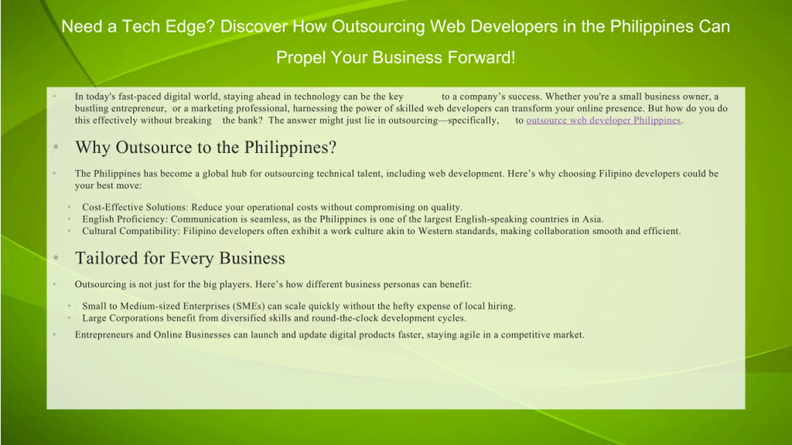 Need a Tech Edge? Discover How Outsourcing Web Developers in the Philippines Can Propel Your Business Forward! In today's fast-paced digital world, staying ahead in technology can be the key bustling entrepreneur, or a marketing professional, harnessing the power of skilled web developers can transform your online presence. But how do you do this effectively without breaking the bank? The answer might just lie in outsourcing specifically, to a company s success. Whether you're a small business owner, a to outsource web developer Philippines. Why Outsource to the Philippines? The Philippines has become a global hub for outsourcing technical talent, including web development. Here s why choosing Filipino developers could be your best move: Cost-Effective Solutions: Reduce your operational costs without compromising on quality. English Proficiency: Communication is seamless, as the Philippines is one of the largest English-speaking countries in Asia. Cultural Compatibility: Filipino developers often exhibit a work culture akin to Western standards, making collaboration smooth and efficient. Tailored for Every Business Outsourcing is not just for the big players. Here s how different business personas can benefit: Small to Medium-sized Enterprises (SMEs) can scale quickly without the hefty expense of local hiring. Large Corporations benefit from diversified skills and round-the-clock development cycles. Entrepreneurs and Online Businesses can launch and update digital products faster, staying agile in a competitive market.