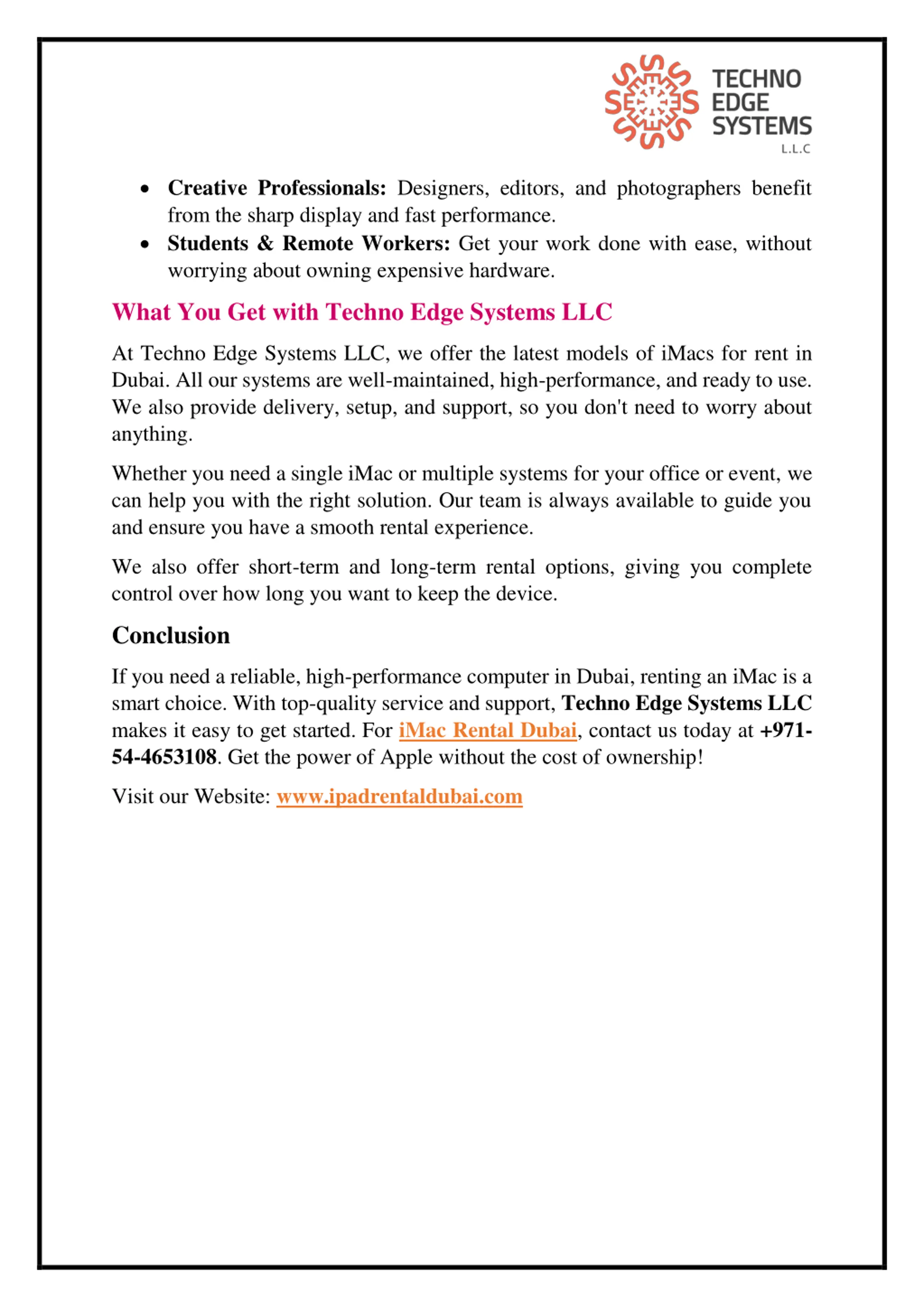 In this PDF, discover the benefits of choosing iMac Rental Dubai for work, events, or creative projects. Techno Edge Systems LLC provides the latest iMacs with setup, support, and flexible rental plans. Save costs and boost productivity. Call us at