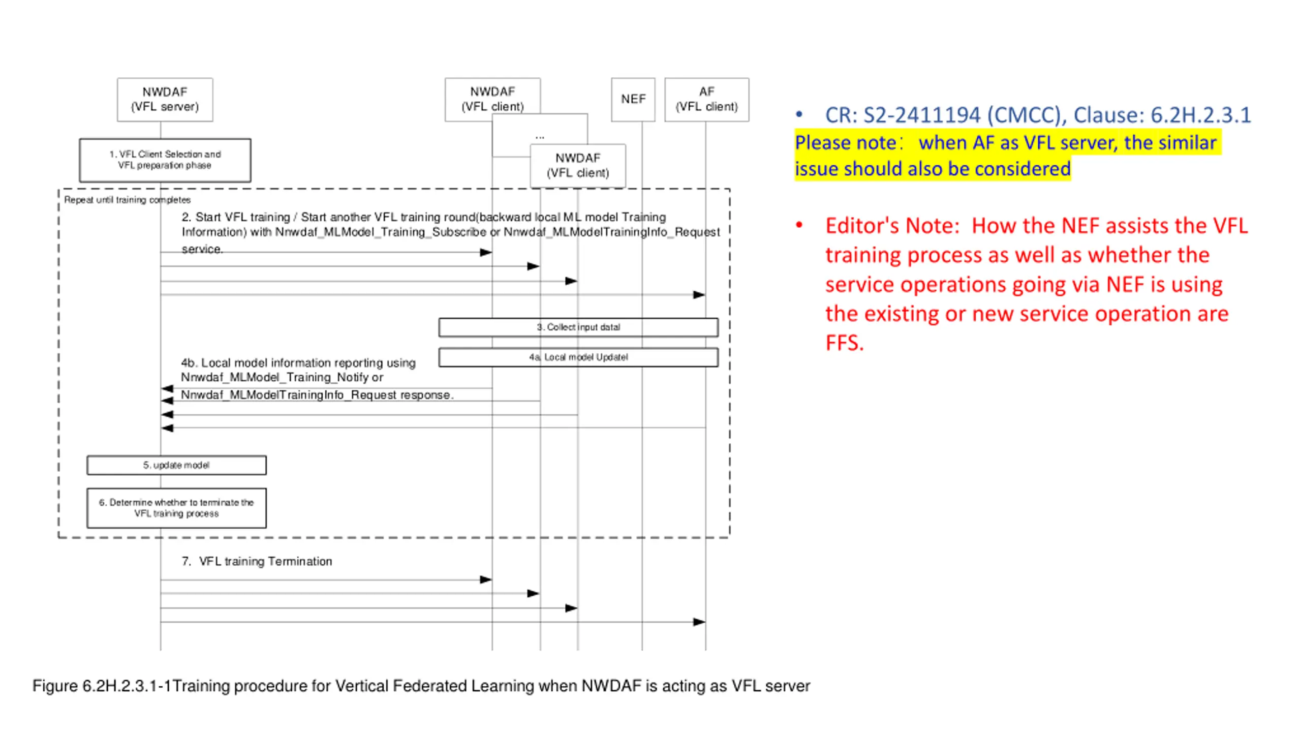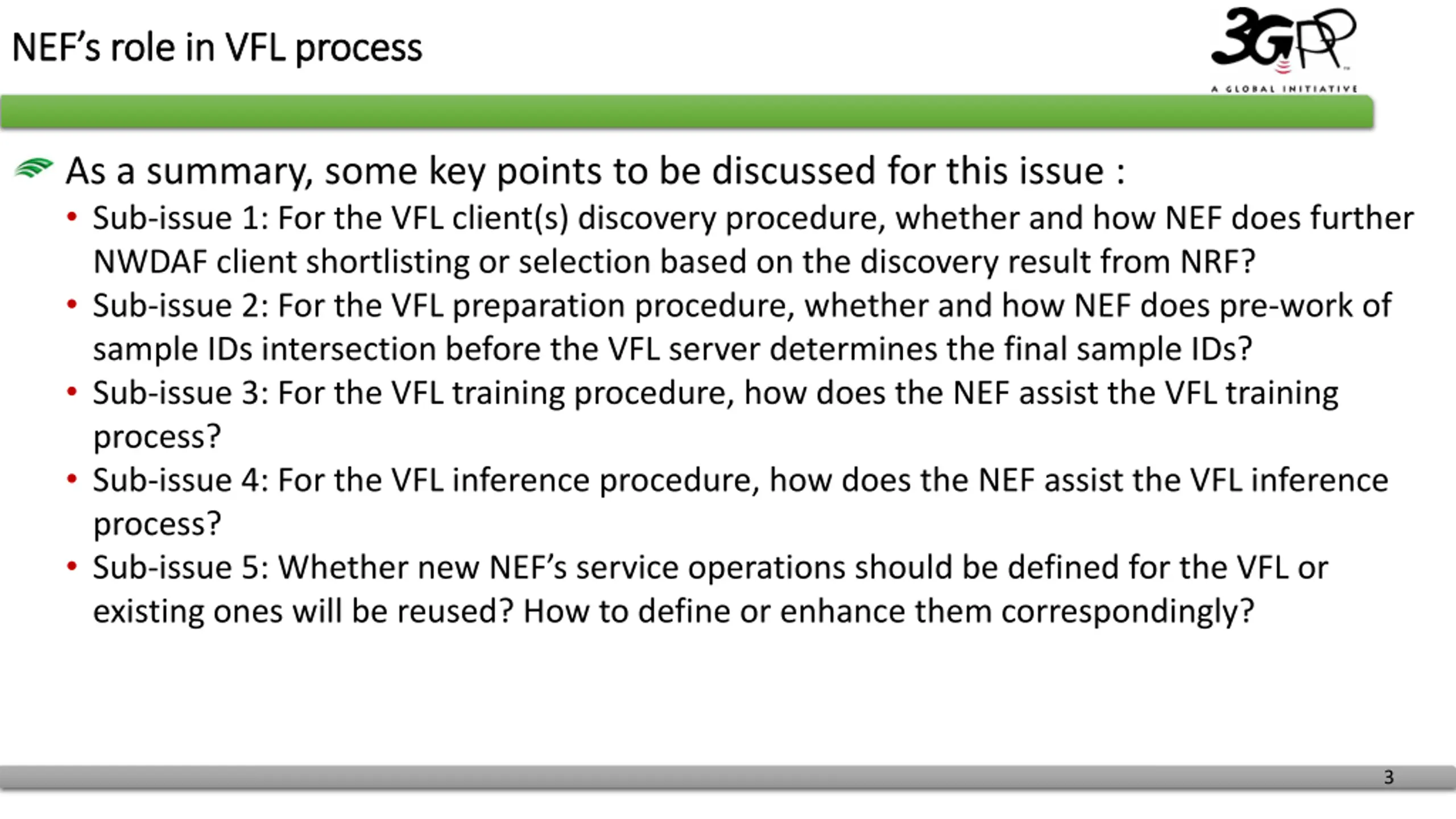 NEFs role in VFL process NEF s role in VFL process As a summary, some key points to be discussed for this issue : Sub-issue 1: For the VFL client(s) discovery procedure, whether and how NEF does further NWDAF client shortlisting or selection based on the discovery result from NRF? Sub-issue 2: For the VFL preparation procedure, whether and how NEF does pre-work of sample IDs intersection before the VFL server determines the final sample IDs? Sub-issue 3: For the VFL training procedure, how does the NEF assist the VFL training process? Sub-issue 4: For the VFL inference procedure, how does the NEF assist the VFL inference process? Sub-issue 5: Whether new NEF s service operations should be defined for the VFL or existing ones will be reused? How to define or enhance them correspondingly? 3