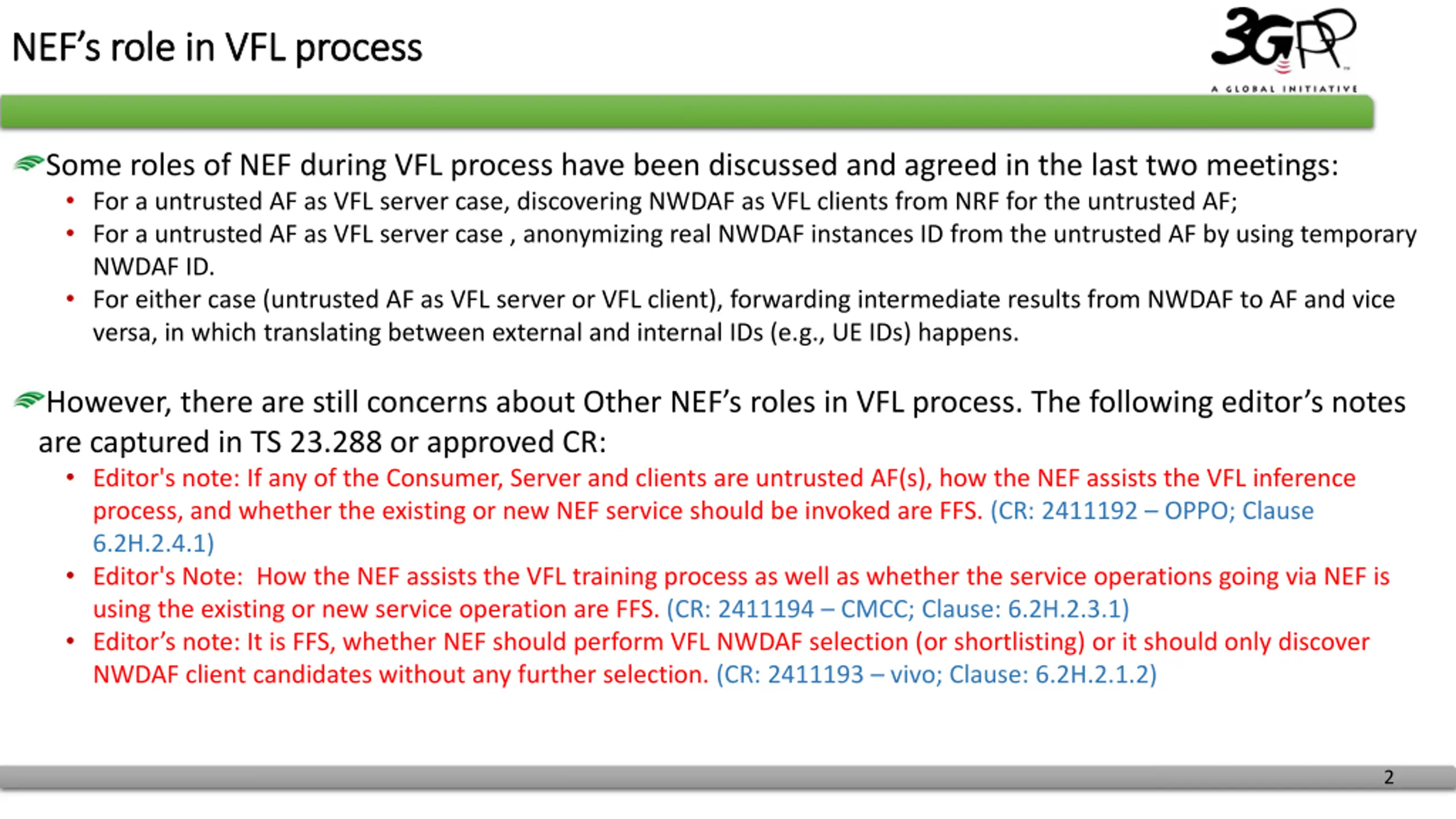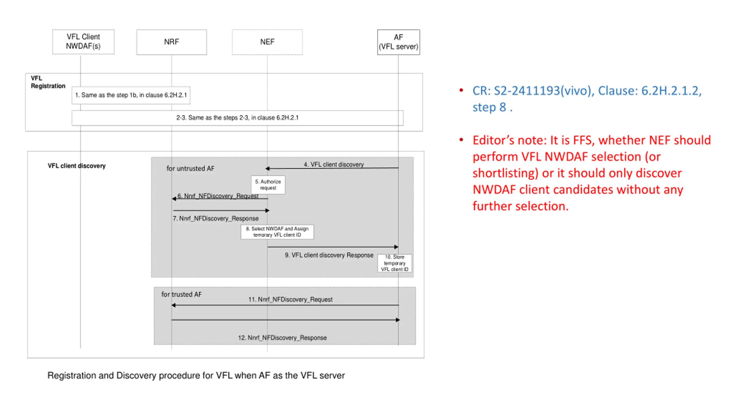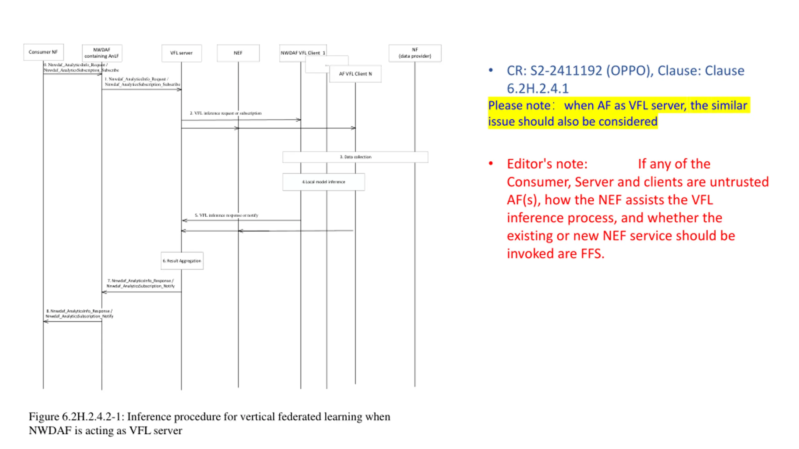 NEFs role in VFL process NEF s role in VFL process Some roles of NEF during VFL process have been discussed and agreed in the last two meetings: For a untrusted AF as VFL server case, discovering NWDAF as VFL clients from NRF for the untrusted AF; For a untrusted AF as VFL server case , anonymizing real NWDAF instances ID from the untrusted AF by using temporary NWDAF ID. For either case (untrusted AF as VFL server or VFL client), forwarding intermediate results from NWDAF to AF and vice versa, in which translating between external and internal IDs (e.g., UE IDs) happens. However, there are still concerns about Other NEF s roles in VFL process. The following editor s notes are captured in TS 23.288 or approved CR: Editor's note: If any of the Consumer, Server and clients are untrusted AF(s), how the NEF assists the VFL inference process, and whether the existing or new NEF service should be invoked are FFS. (CR: 2411192 OPPO; Clause 6.2H.2.4.1) Editor's Note: How the NEF assists the VFL training process as well as whether the service operations going via NEF is using the existing or new service operation are FFS. (CR: 2411194 CMCC; Clause: 6.2H.2.3.1) Editor s note: It is FFS, whether NEF should perform VFL NWDAF selection (or shortlisting) or it should only discover NWDAF client candidates without any further selection. (CR: 2411193 vivo; Clause: 6.2H.2.1.2) 2