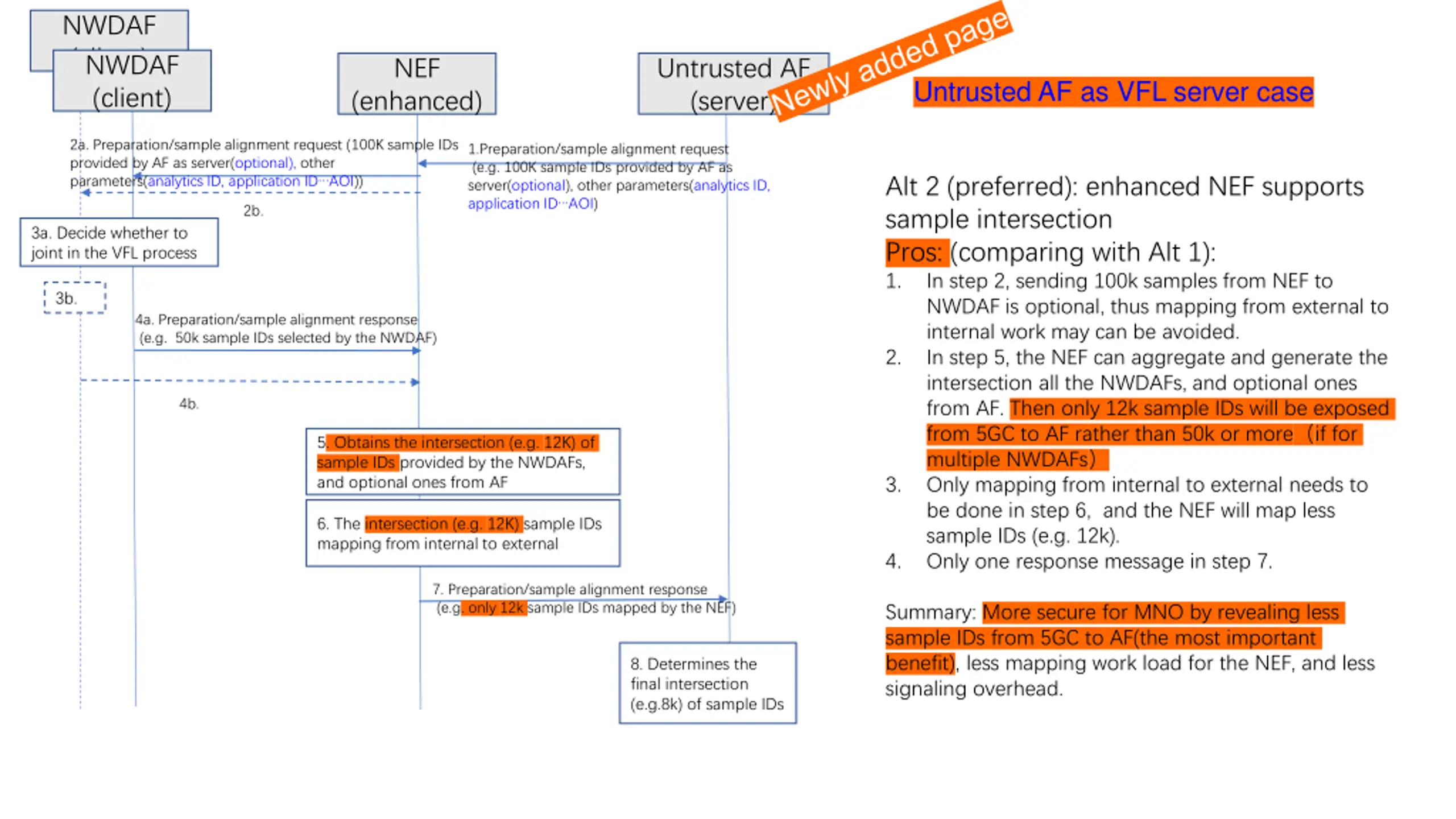NWDAF (client) NWDAF (client) NEF Untrusted AF (server) Untrusted AF as VFL server case (enhanced) 2a. Preparation/sample alignment request (100K sample IDs provided by AF as server(optional), other parameters(analytics ID, application ID AOI)) 1.Preparation/sample alignment request (e.g. 100K sample IDs provided by AF as server(optional), other parameters(analytics ID, application ID AOI) Alt 2 (preferred): enhanced NEF supports sample intersection Pros: (comparing with Alt 1): 1. In step 2, sending 100k samples from NEF to NWDAF is optional, thus mapping from external to internal work may can be avoided. 2. In step 5, the NEF can aggregate and generate the intersection all the NWDAFs, and optional ones from AF. Then only 12k sample IDs will be exposed from 5GC to AF rather than 50k or more if for multiple NWDAFs 3. Only mapping from internal to external needs to be done in step 6, and the NEF will map less sample IDs (e.g. 12k). 4. Only one response message in step 7. 2b. 3a. Decide whether to joint in the VFL process 3b. 4a. Preparation/sample alignment response (e.g. 50k sample IDs selected by the NWDAF) 4b. 5. Obtains the intersection (e.g. 12K) of sample IDs provided by the NWDAFs, and optional ones from AF 6. The intersection (e.g. 12K) sample IDs mapping from internal to external 7. Preparation/sample alignment response (e.g. only 12k sample IDs mapped by the NEF) Summary: More secure for MNO by revealing less sample IDs from 5GC to AF(the most important benefit), less mapping work load for the NEF, and less signaling overhead. 8. Determines the final intersection (e.g.8k) of sample IDs