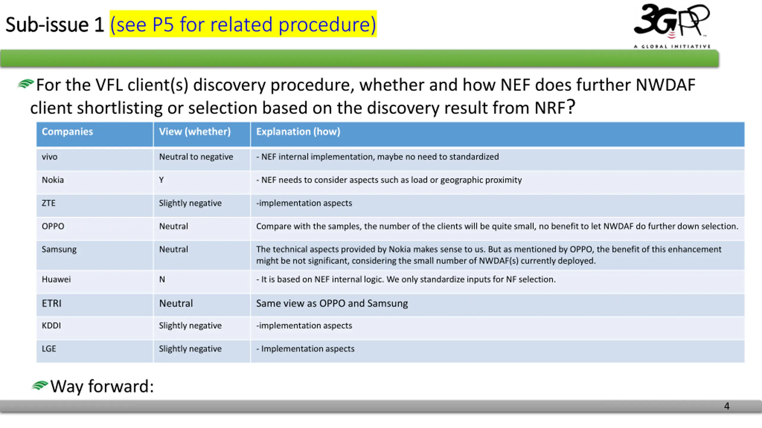 Sub Sub- -issue 1 issue 1 (see P5 for related procedure) For the VFL client(s) discovery procedure, whether and how NEF does further NWDAF client shortlisting or selection based on the discovery result from NRF? Companies View (whether) Explanation (how) vivo Neutral to negative - NEF internal implementation, maybe no need to standardized Nokia Y - NEF needs to consider aspects such as load or geographic proximity ZTE Slightly negative -implementation aspects OPPO Neutral Compare with the samples, the number of the clients will be quite small, no benefit to let NWDAF do further down selection. Samsung Neutral The technical aspects provided by Nokia makes sense to us. But as mentioned by OPPO, the benefit of this enhancement might be not significant, considering the small number of NWDAF(s) currently deployed. Huawei N - It is based on NEF internal logic. We only standardize inputs for NF selection. ETRI Neutral Same view as OPPO and Samsung KDDI Slightly negative -implementation aspects LGE Slightly negative - Implementation aspects Way forward: 4