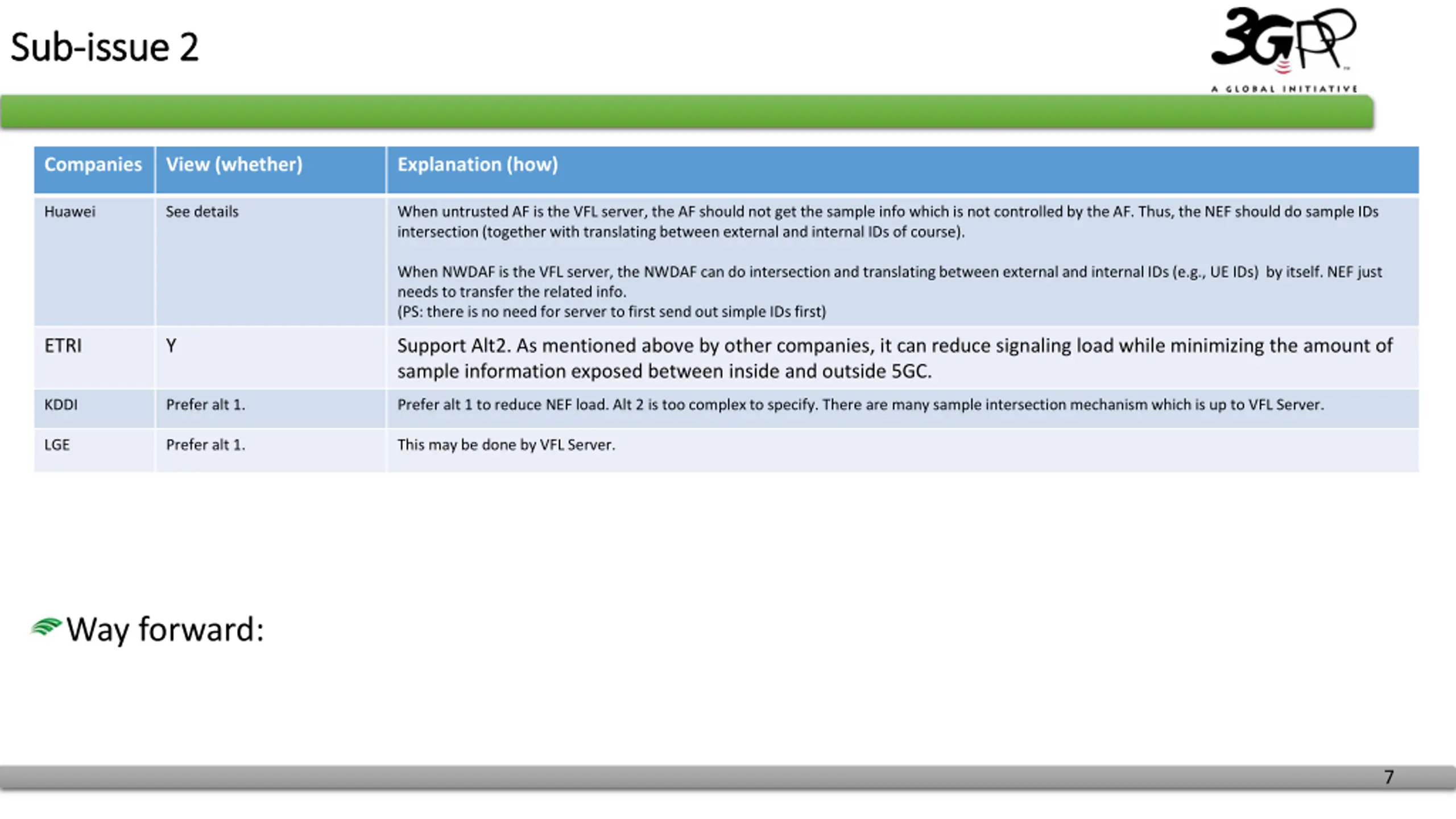 Sub Sub- -issue 2 issue 2 Companies View (whether) Explanation (how) Huawei See details When untrusted AF is the VFL server, the AF should not get the sample info which is not controlled by the AF. Thus, the NEF should do sample IDs intersection (together with translating between external and internal IDs of course). When NWDAF is the VFL server, the NWDAF can do intersection and translating between external and internal IDs (e.g., UE IDs) by itself. NEF just needs to transfer the related info. (PS: there is no need for server to first send out simple IDs first) ETRI Y Support Alt2. As mentioned above by other companies, it can reduce signaling load while minimizing the amount of sample information exposed between inside and outside 5GC. KDDI Prefer alt 1. Prefer alt 1 to reduce NEF load. Alt 2 is too complex to specify. There are many sample intersection mechanism which is up to VFL Server. LGE Prefer alt 1. This may be done by VFL Server. Way forward: 7